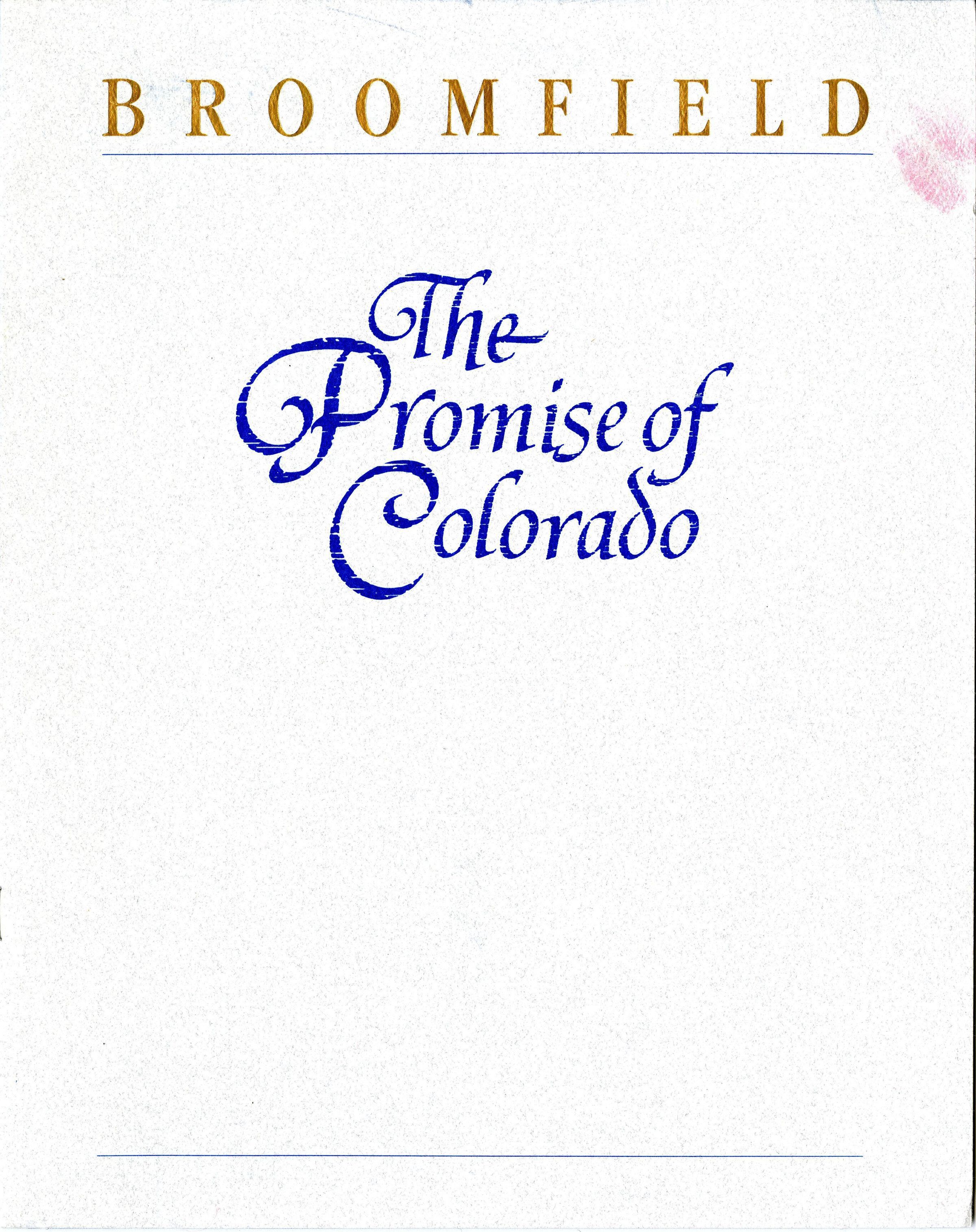 An informational booklet titled, "Broomfield: The Promise of Colorado," circa 1989. The booklet is 9" x 11", staple bound, 8 pages, with textured folder paper for its covers. The cover has gold colored lettering at the top, with blue text near the center.