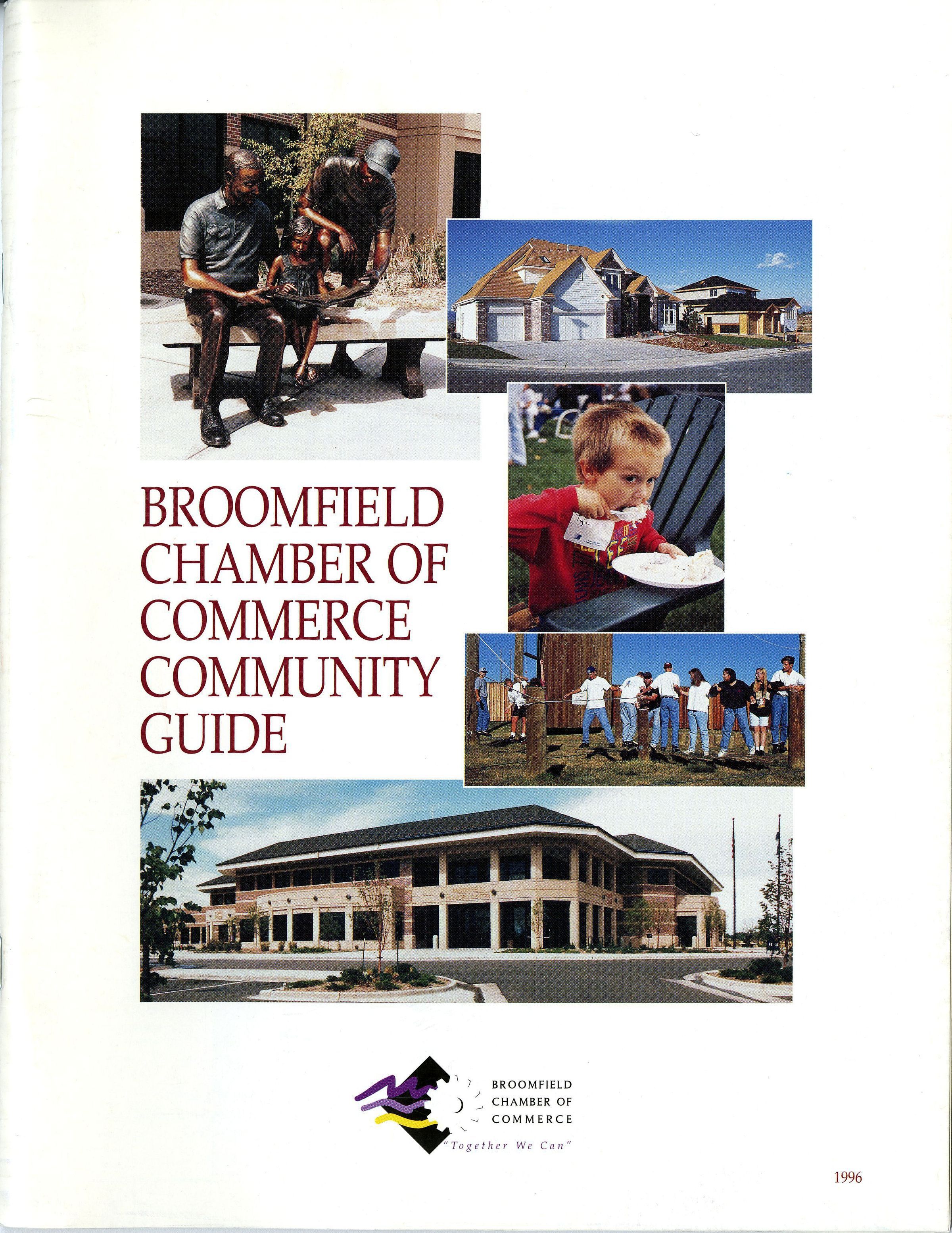 A guidebook from the Broomfield Chamber of Commerce, 1996. The book is 8.5" x 11", staple bound, 63 pages. The cover is white with 5 photograph images - a statue of two adults reading to a child, houses, a boy eating ice cream, people balancing on a rope, and the Broomfield Municipal Center. The guidebook contains various articles on Broomfield, covering topics such as history, education, housing, recreation, economic develpment, and city government. Pictures of Broomfield, its residents, and activities are included, along with advertisements for local businesses. The end half of the book contains a community services directory, broomfield Chamber of Commerce programs, a Chamber directory, a goods and services directory, and maps of the Broomfield area.Collection