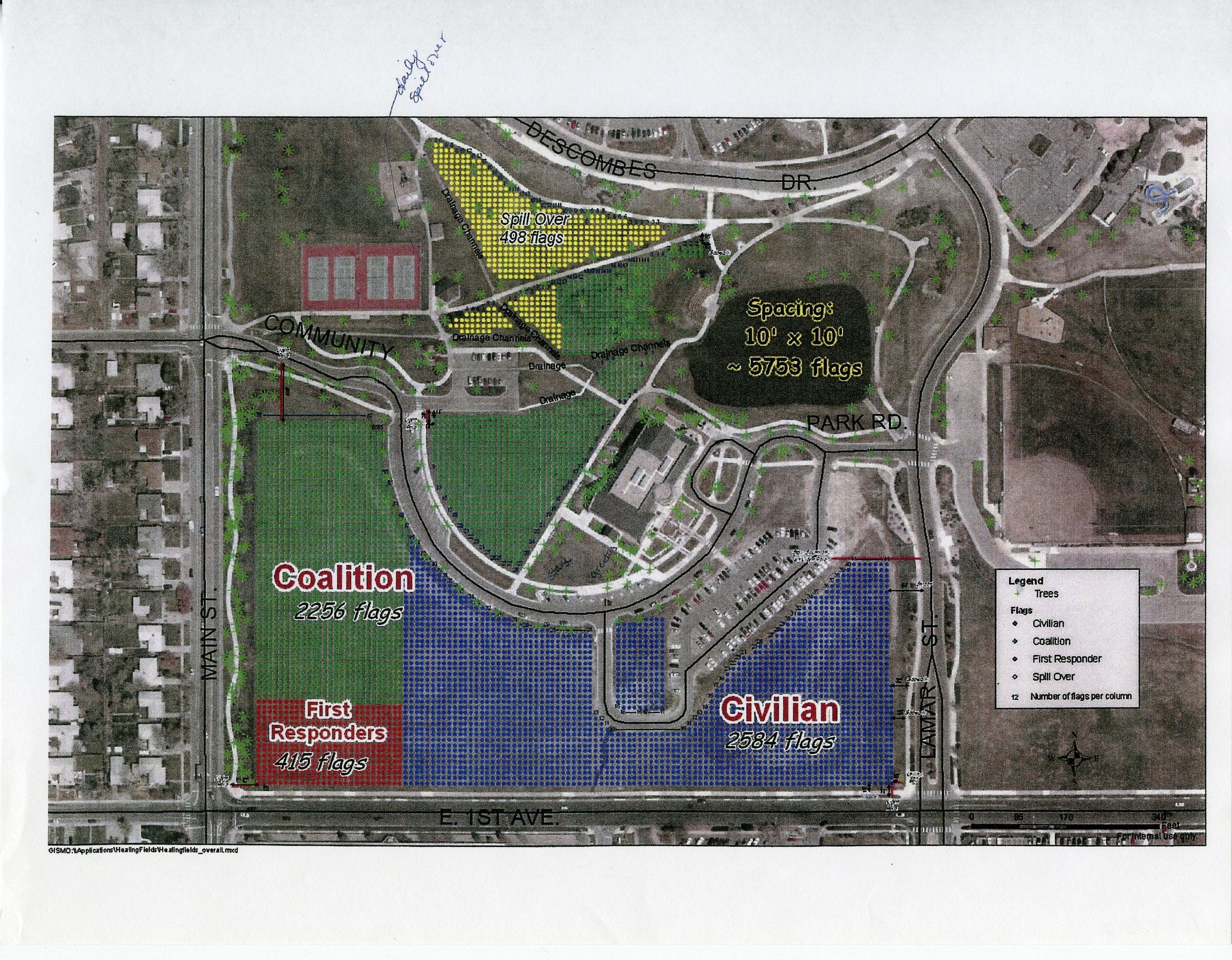 The Healing Field Flag Memorial Collection contains a program, four brochures, two conceptual maps, and three handouts pertaining to Broomfield's 2005 memorialization of the 2001 September 11th terrorist attacks. Broomfield residents, in conjunction with the City and County of Broomfield, Broomfield Police, and North Metro Fire Rescue, placed approximately 5,753 three-by-five-foot American flags in the park space around the Mamie Doud Eisenhower Public Library. The flags represented the civilian victims and first responders who died from the attacks, and members of the coalition forces who had died in the wars in Iraq and Afghanistan. The event was a national effort, with Broomfield bringing one field to the Denver-Metro area. Proceeds from sponsored flags were ultimately used to create a permanent, local 9/11 memorial near the library.Collection