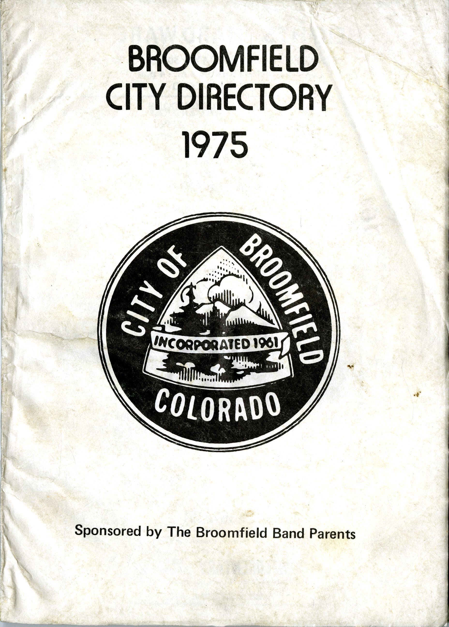 Broomfield City Directory published by The Broomfield Band Parents, 1975. The directory is 6.25" x 8.5", adhesive bound, 140 pages. The cover is made of paper, with a City of Broomfield seal containing an image of trees, clouds, and mountains. The directory was sponsored by The Broomfield Band Parents. Contents include general numbers for the area, such as emergency services, city information, medical practices, churches, schools, and organizations. The majority of the directory is comprised of residence phone numbers, addresses, and descriptions of household professions, as well as another list of numbers by street. A service business directory is included in the back of the directory, and advertisements for local businesses are scattered throughout.Collection