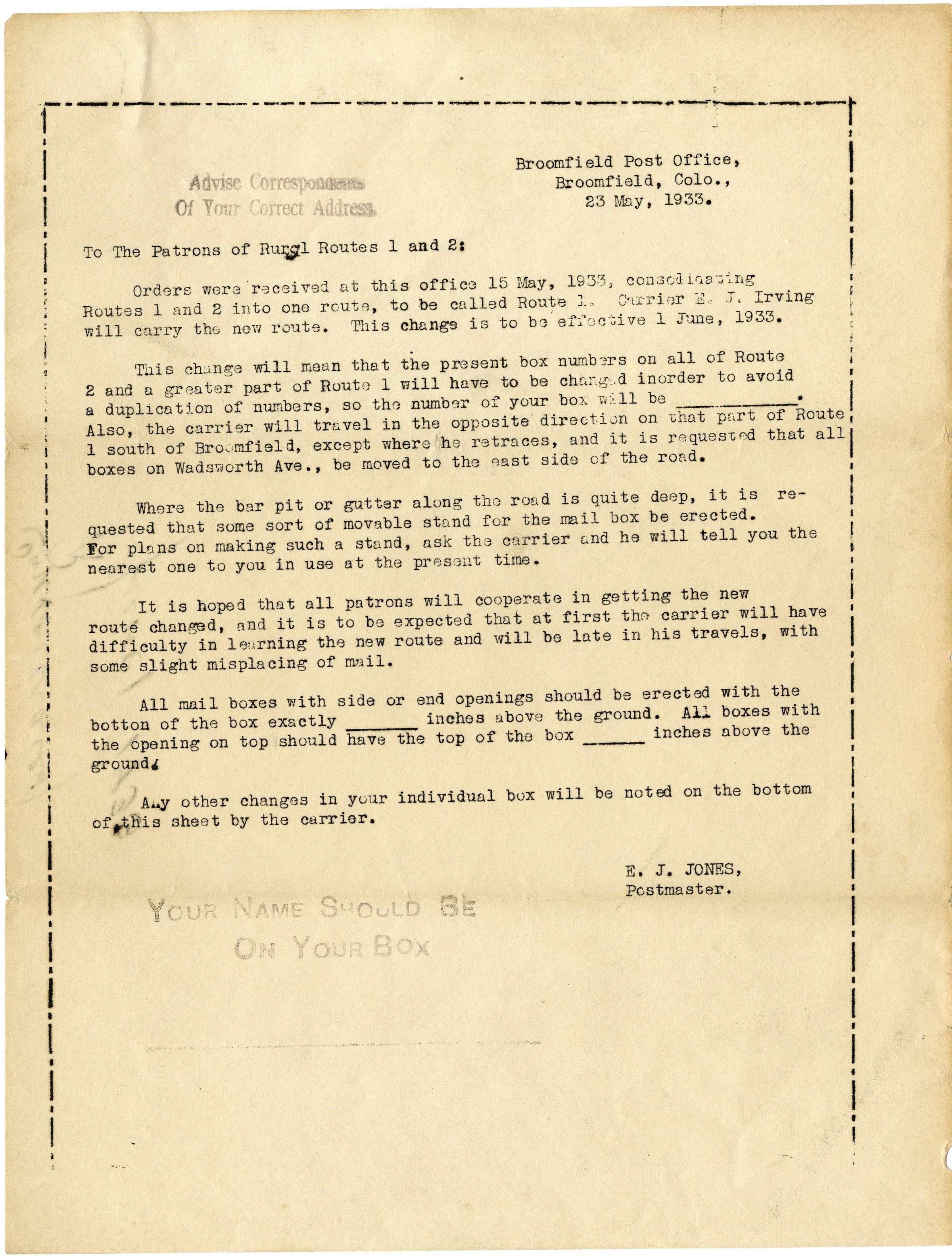 A collection of letters, memoranda, and other types of correspondence used by the Broomfield Post Office, 1898-1958. Noteworthy contents include correspondence sent by and/or to Broomfield postmasters Edgar J. Jones and Miles Crawford, mailed announcements of Broomfield's new post office in 1958, and letters relating to route changes and other operations around the Broomfield area. Letters are arranged chronologically.