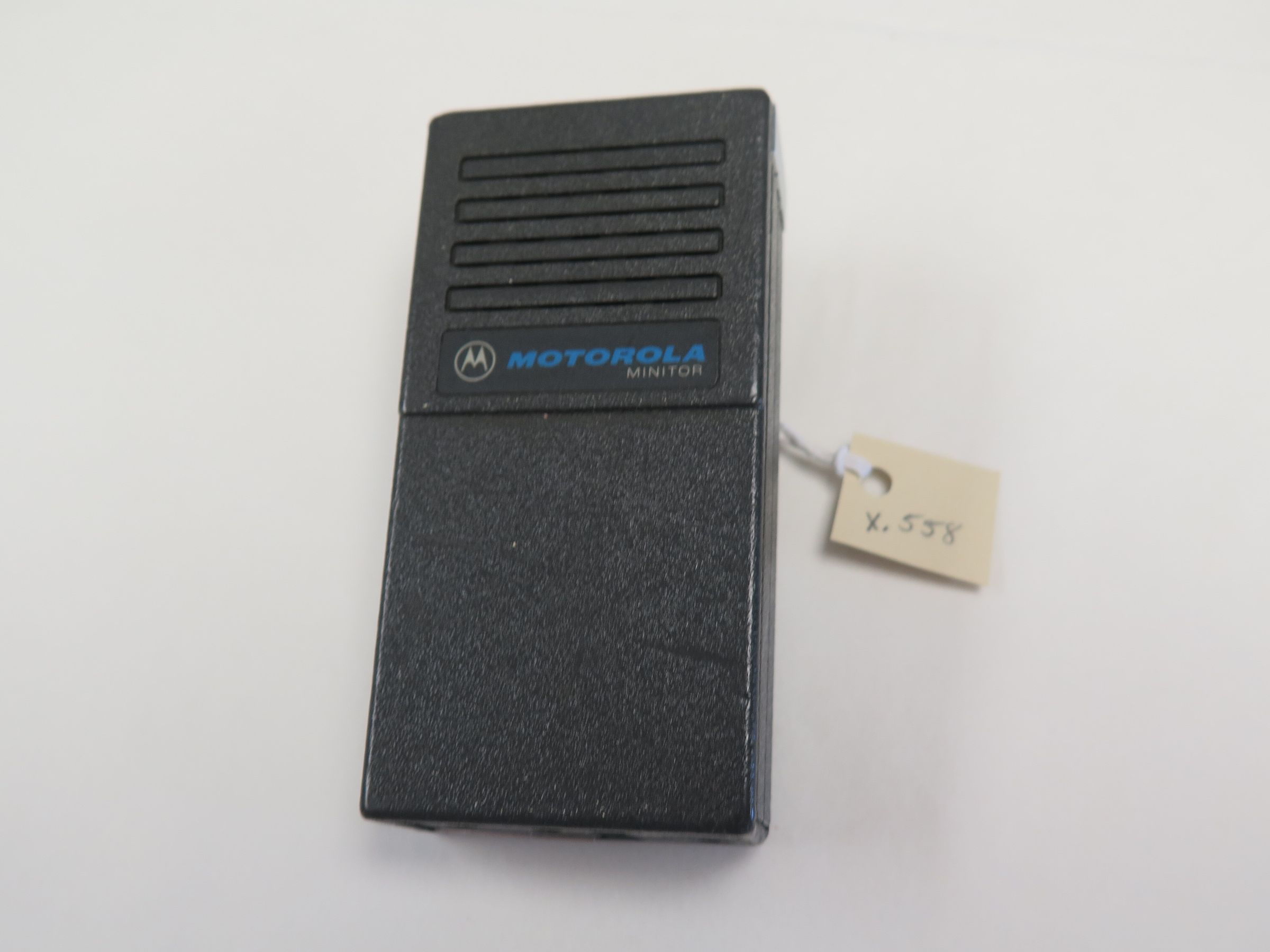 This is a Motorola brand Minitor voice pager or radio. The pager is black and made of plastic. The pager measures 5" (h) x 2" (w) x 1" (l).
