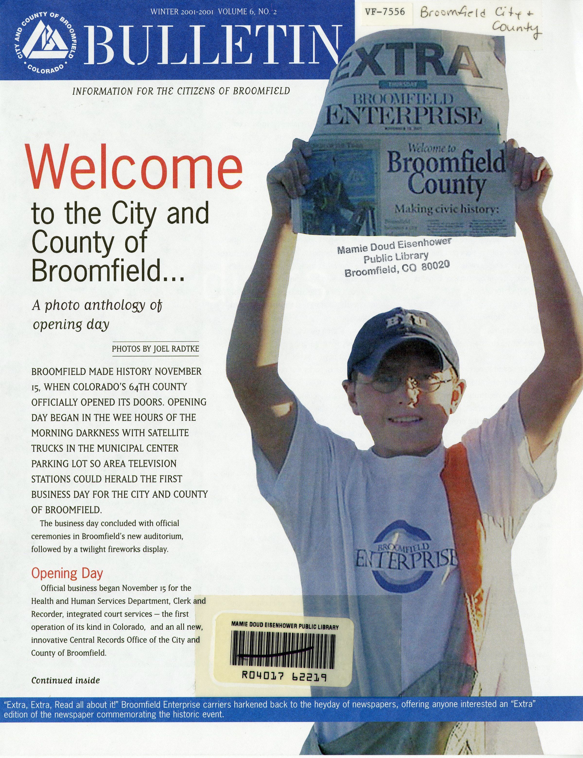 Volume 6, number 2 edition of Bulletin. Published in 2001. Focuses on the City and County of Broomfield. Shows the development and welcomes all residents to the new county.