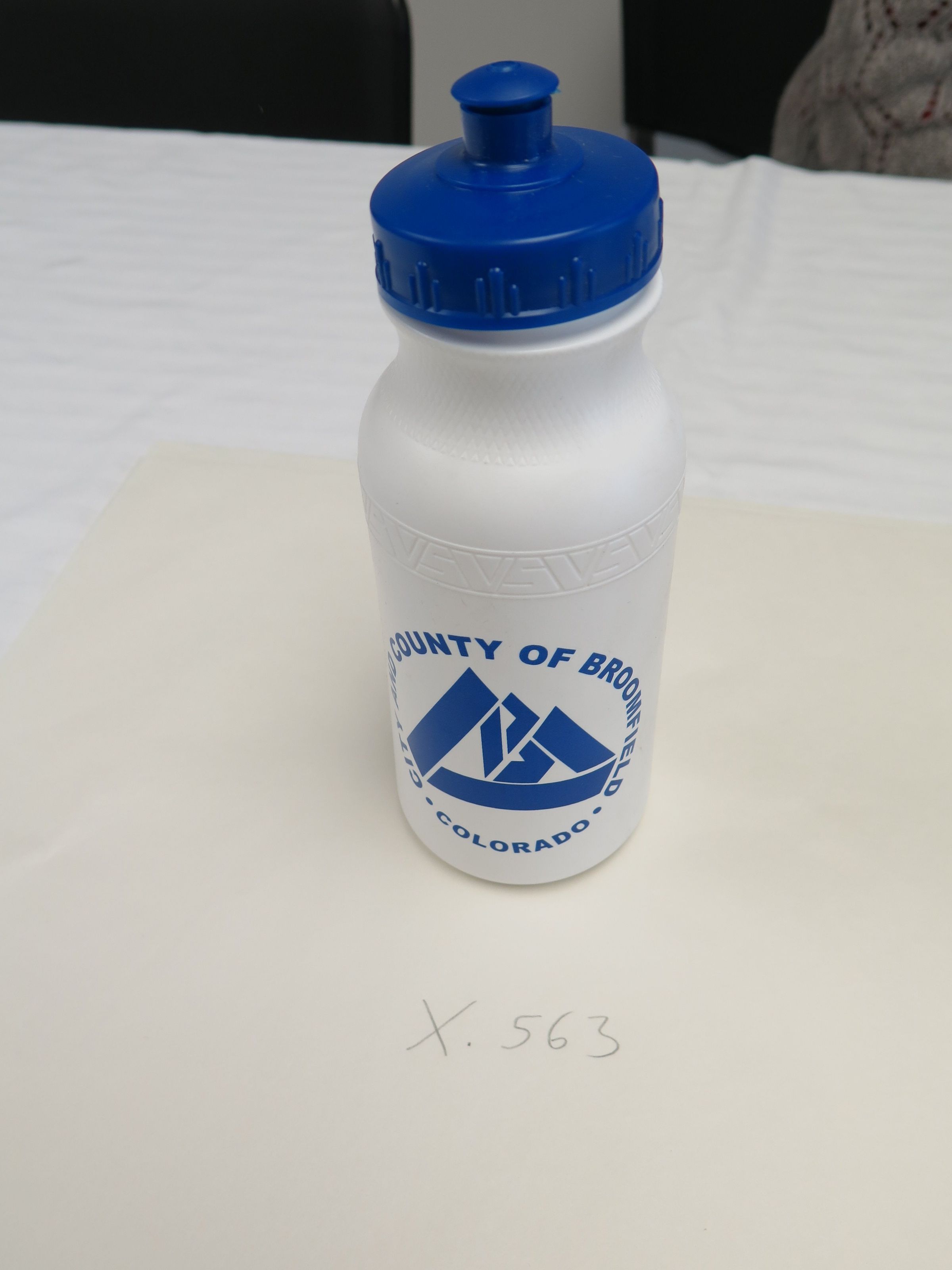 This is a white plastic water bottle with a blue top and blue text on the front. The text is in a circle around the Broomfield City logo and reads, "City and County of Broomfield Colorado". The water bottle measures 8" (h) x 2.5" (dia).