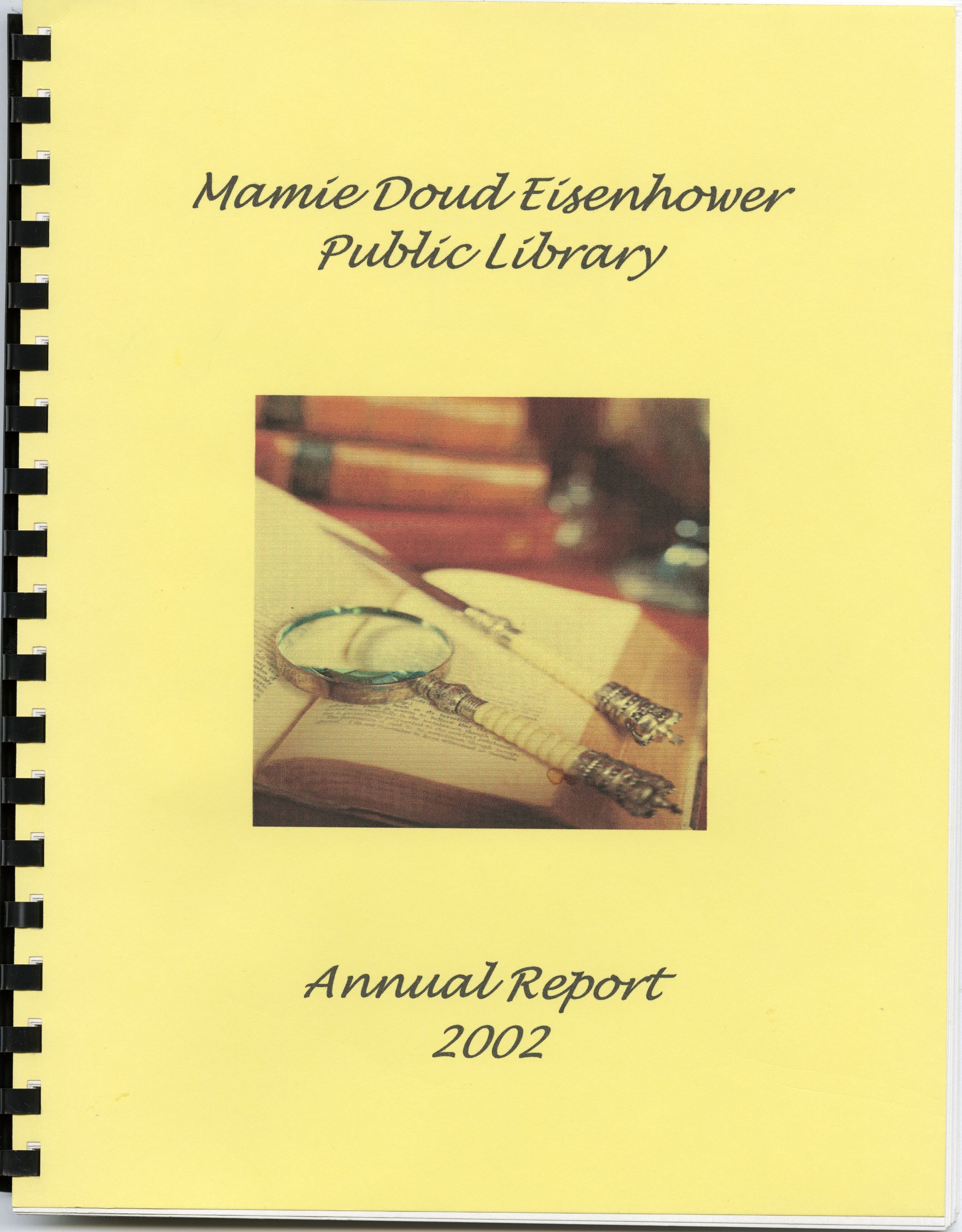Item is a spiral-bound collection of papers that serve as the Mamie Doud Eisenhower Public Library Annual Report for 2002. The cover is yellow and features a colored image of a magnifying glass resting atop an open book. The report contains information about a variety of library services, including statistics about materials, library activities, circulation data, and events for the children and young adult chapters of the building. Information about loans and technology is also included.