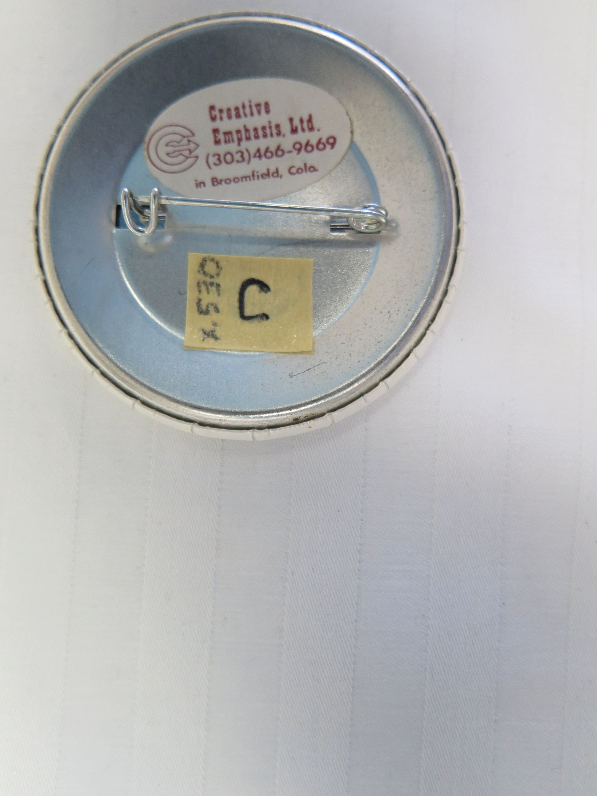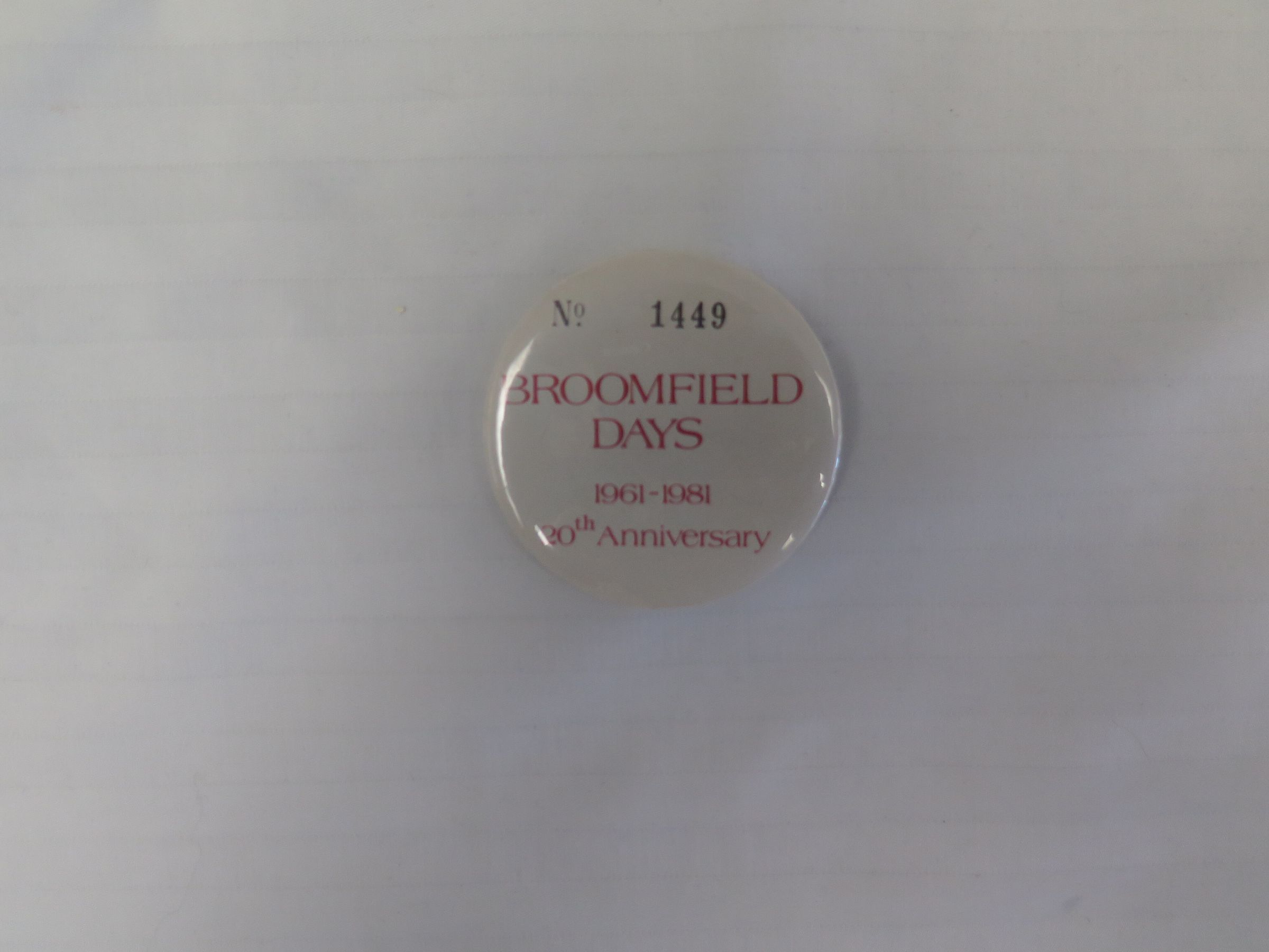 This is a round white button with red text on the front that reads, "No. 1449/ Broomfield/ Days/ 1961-1981/ 20th Anniversary". The button measures 2.25" (dia).