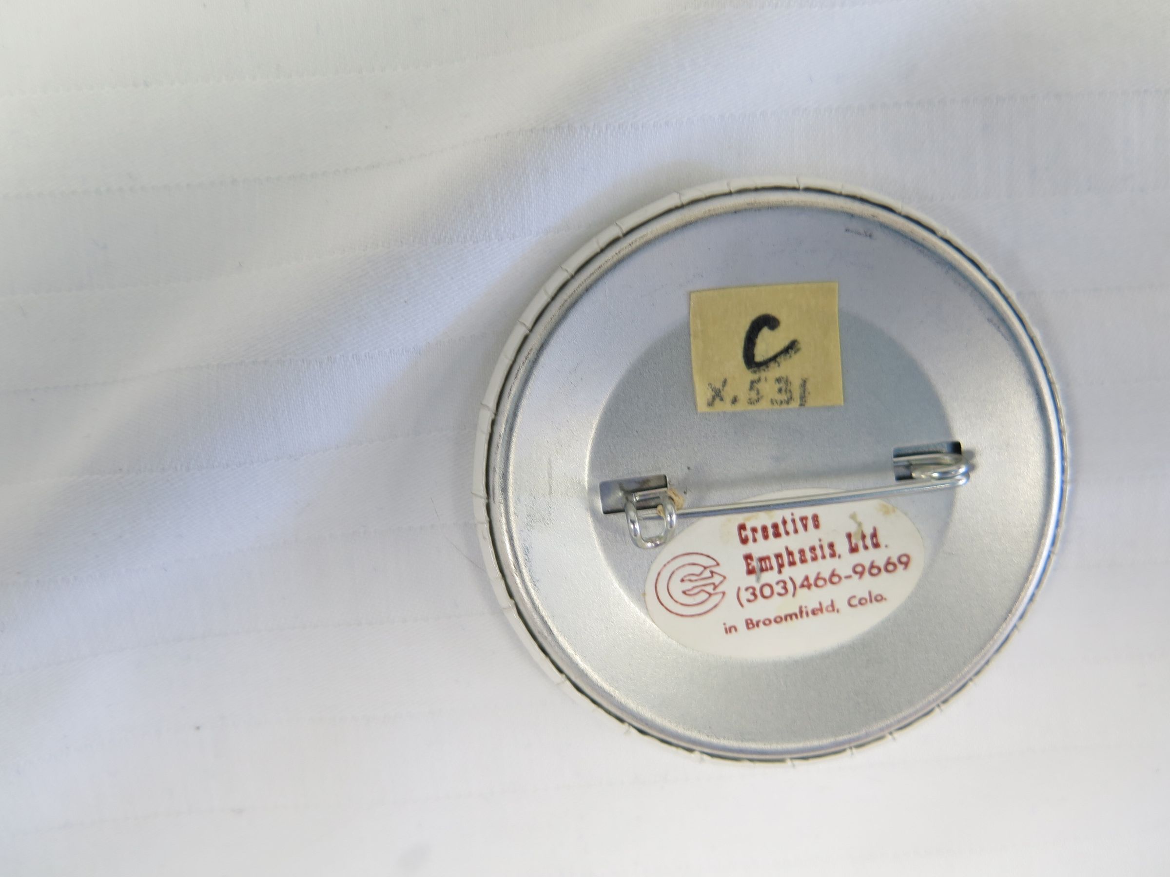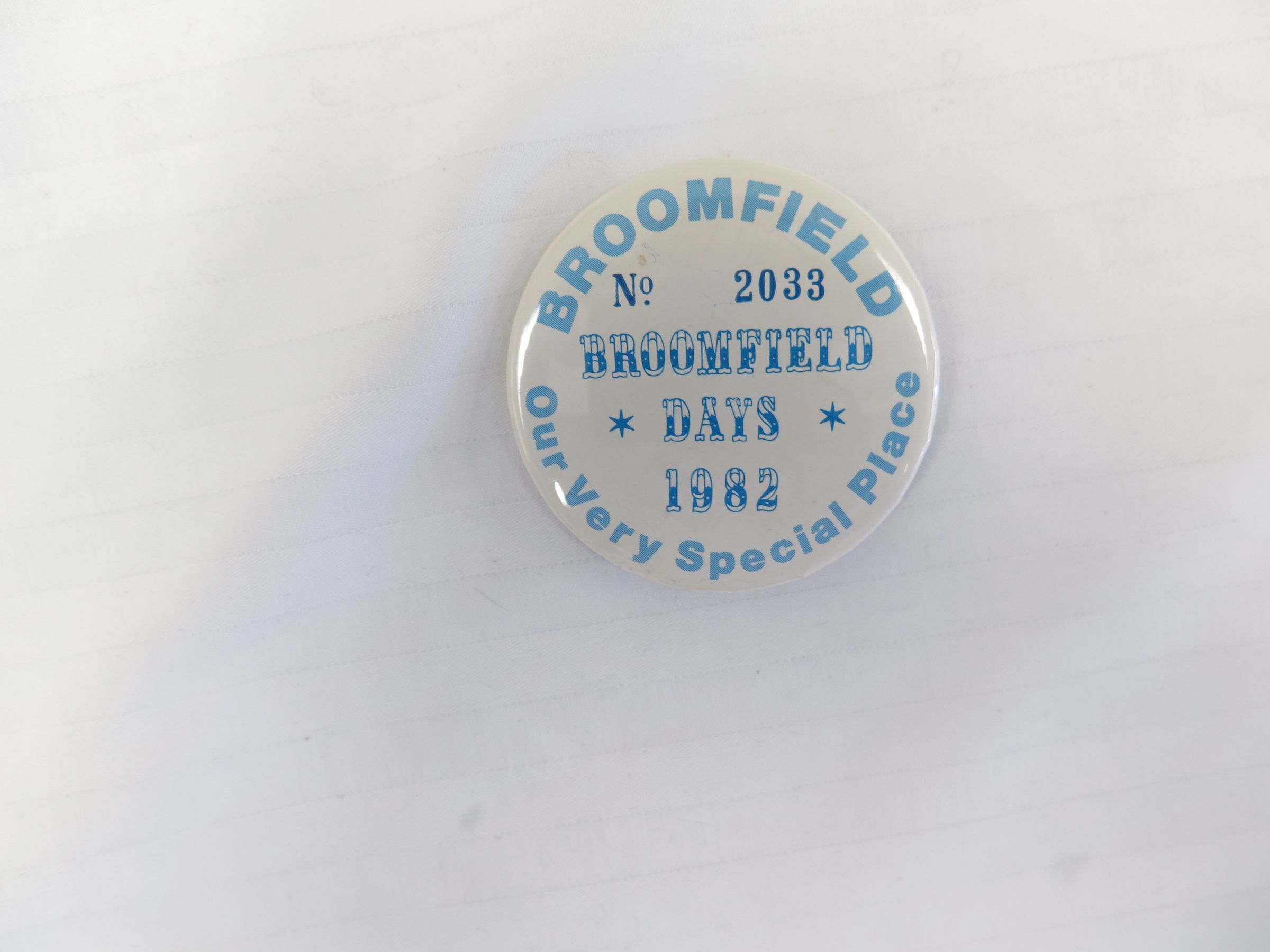 This is a round white button with blue text on the front. The text reads, "Broomfield/ Our Very Special Place/ No. 2033/ Broomfield/ Days/ 1982". The button measures 2.25" (dia).