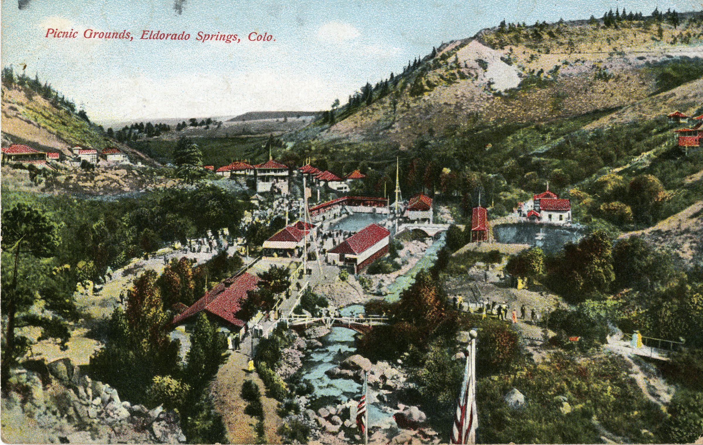 Postcard of Eldorado Springs Picnic Grounds, circa 1910. The postcard is 3.5" x 5.5". The front has a color illustration of the entire Eldorado Springs resort from an aerial view, with several buildings, the swimming pool, and South Boulder Creek visible. The text "Picnic Grounds, Eldorado Springs, Colo." is printed in the upper left corner. The reverse side has a handwritten message to a May York of Madison, Kansas, giving good wishes while the writer was at school.Collection