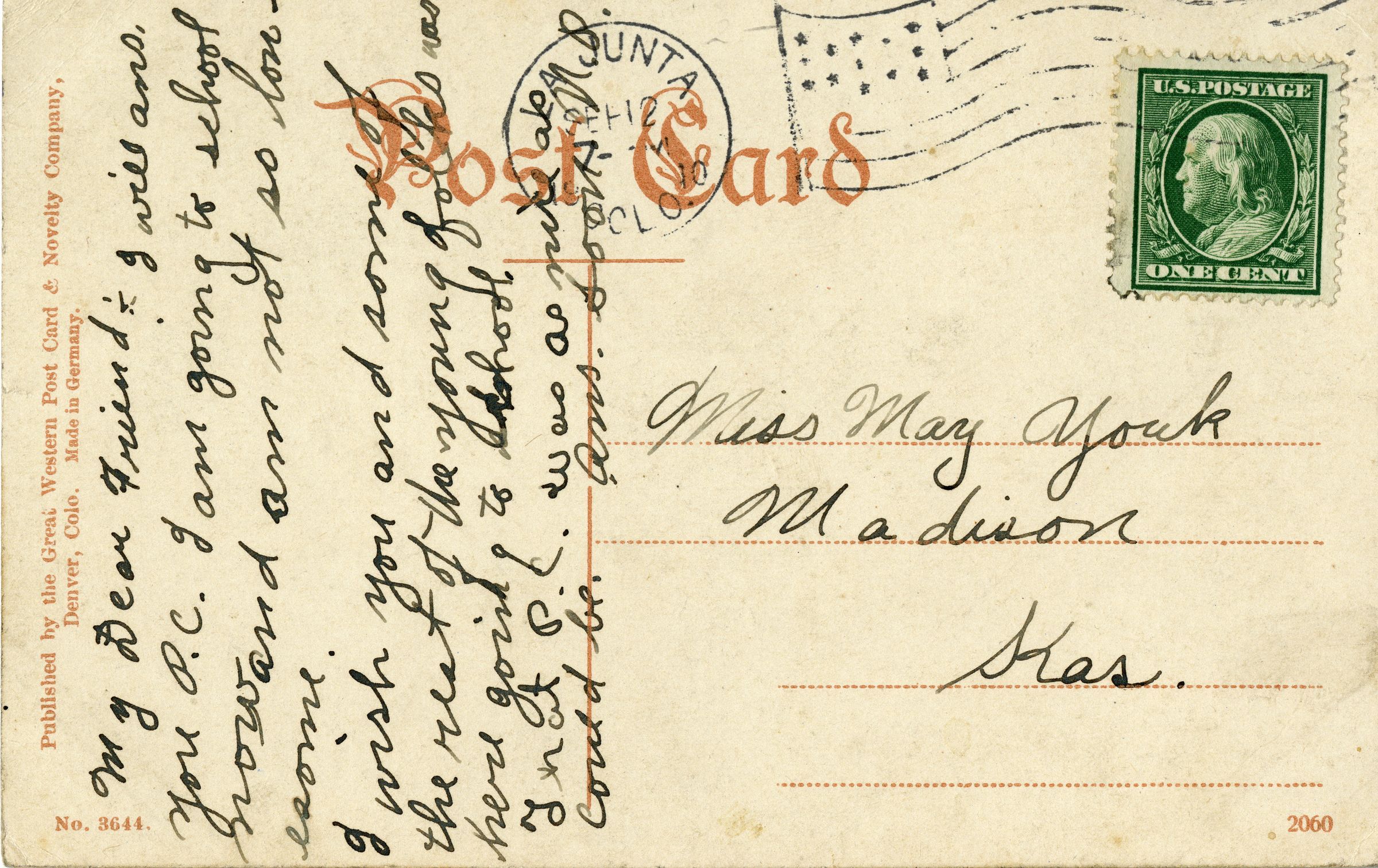 Custodial History: Group of postcards donated to the Broomfield Depot Museum by Adam Evearitt in 2017. Evearitt obtained this postcard from user "Gramtourre43" in Elkhart, Indiana through ebay. The original creator and owner of the postcard is unknown.