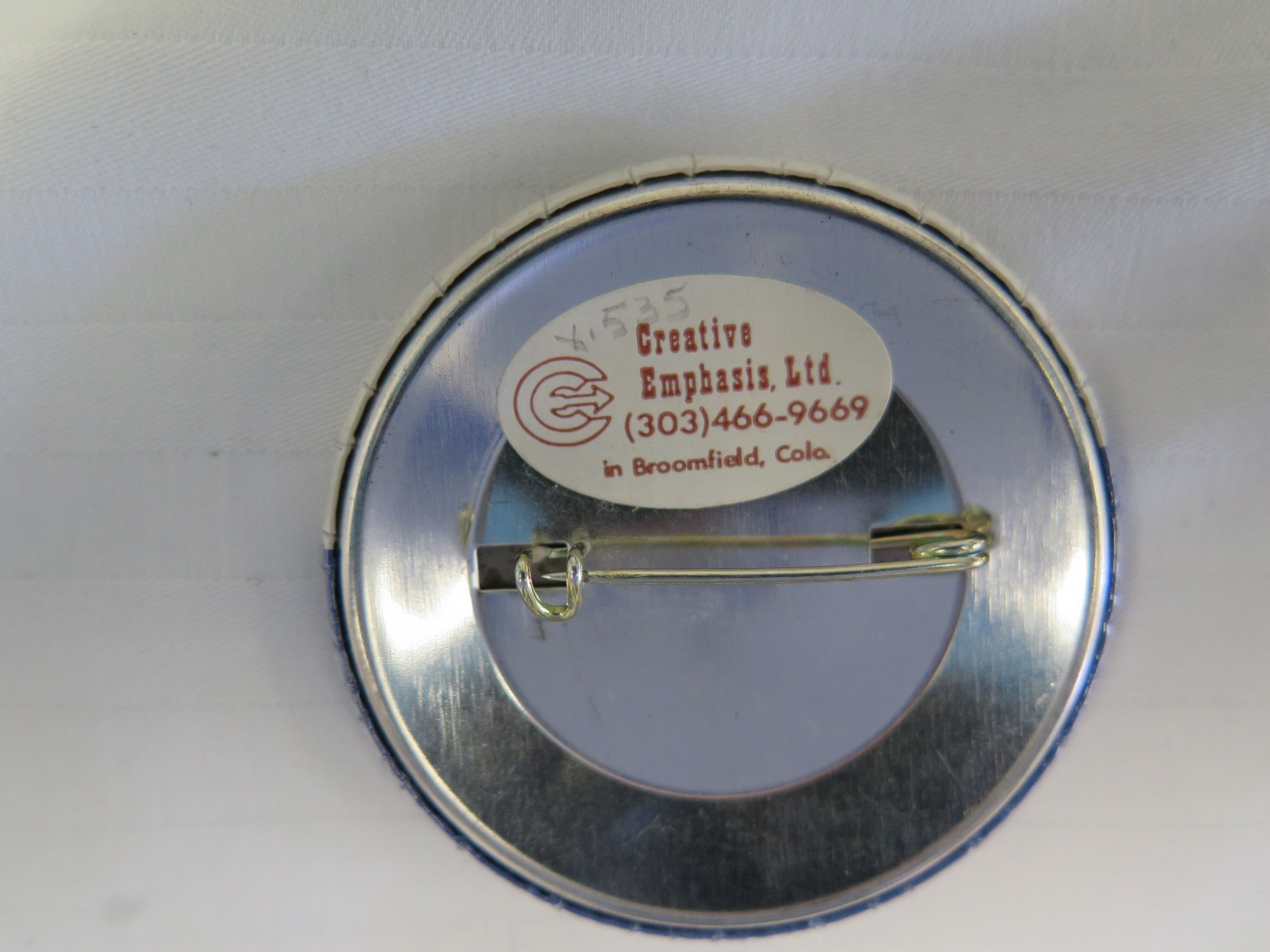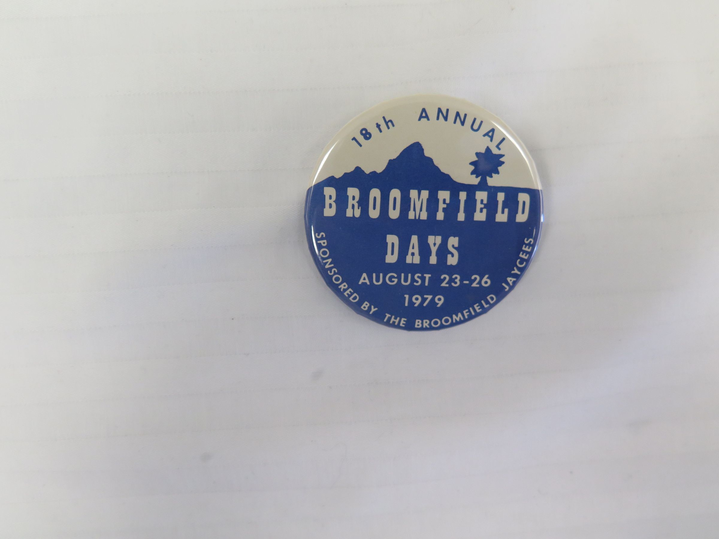 This is a round blue and white button with text on the front. The text reads, "18th Annual/ Broomfield Days/ August 23-26/ 1979/ Sponsored by the Broomfield Jaycees". The button measures 2.25" (dia).