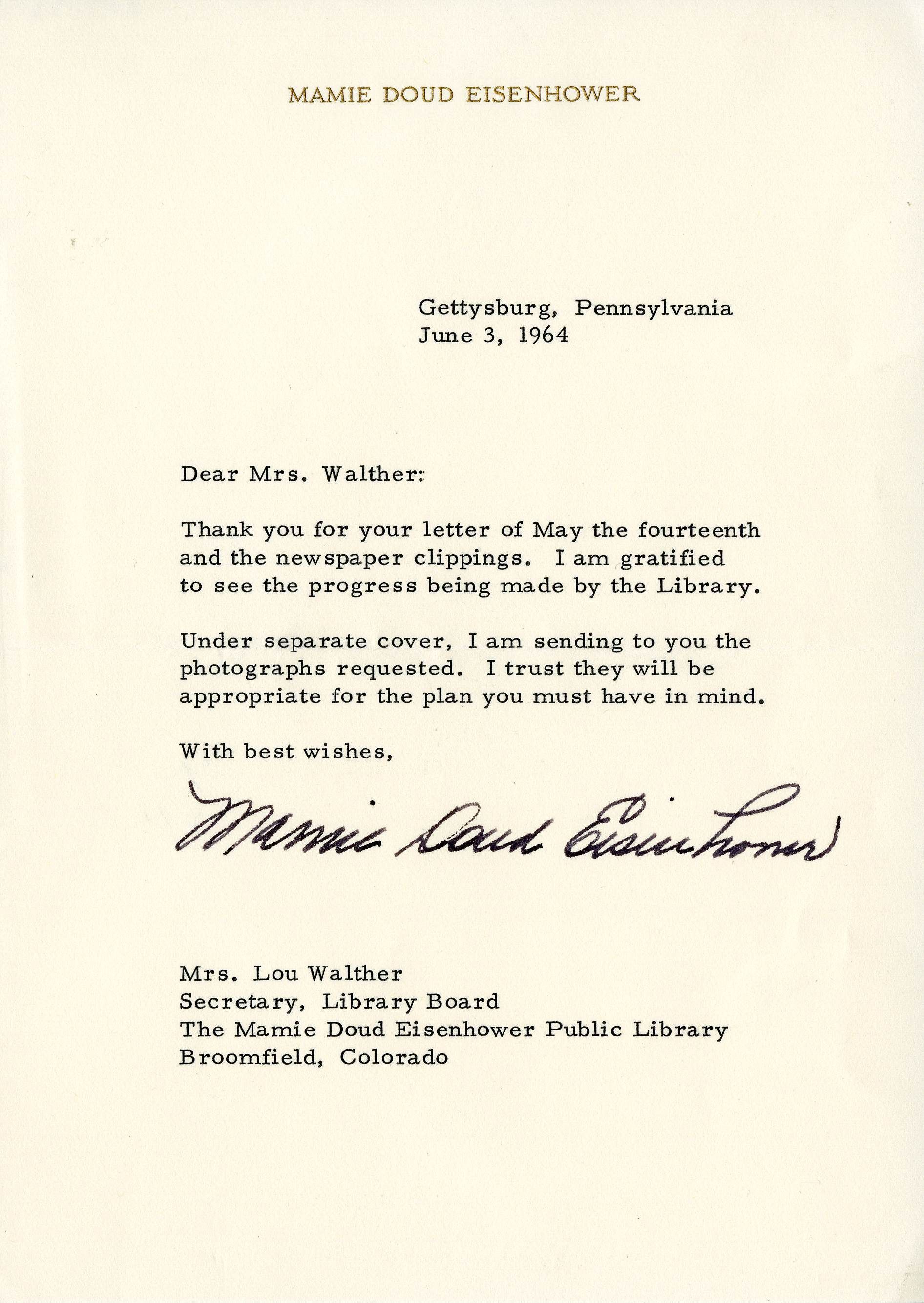 A letter from First Lady Mamie Doud Eisenhower to Lou Walther, dated June 3, 1964. The letter is 6.5" x 9." The top of the letter has gold, raised letterhead stating, "Mamie Doud Eisenhower." Mamie sent the letter from Gettysburg, Pennsylvania, writing to thank Walther for a letter and newspaper clippings that she had sent the previous month regarding the Mamie Doud Eisenhower Library. Walther was the Library Board Secretary. Unspecified photographs were originally sent along with the letter. Mamie also signed her name, in ink, near the bottom of the letter.Collection
