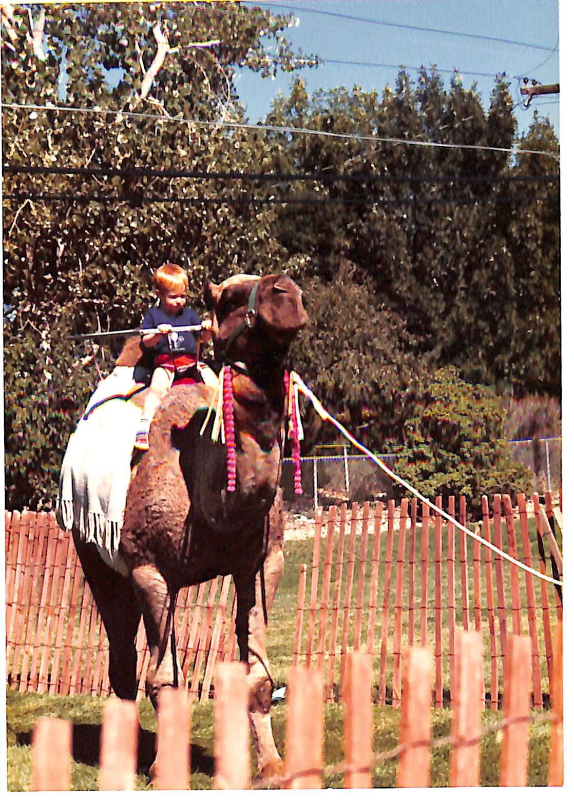 Item is a photograph printed on Kodak paper taken during the 1989 Broomfield Days event. In the photo a blond little boy with a blue t-shirt and red shorts is riding on the blanketed back of a camel. The camel is being led throughout its fenced-off enclosure by someone (out of view) holding a string, and it has purple tassles hanging around its neck. A grassy field, powerlines, and large trees complete the background.Photograph Details