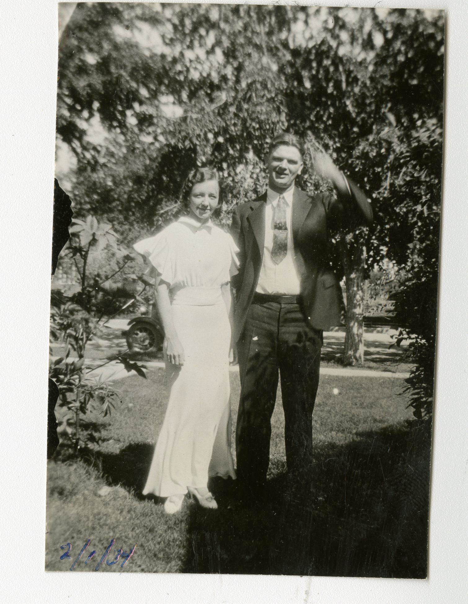 Black and white photograph of a couple. at least one person is either a relation or a friend to the Brunner family. Photograph was printed at Van Bradt Photo, located at 301 16th St, Denver, CO. Handwritten on the back of the photograph is Married Feb 1, 1934.