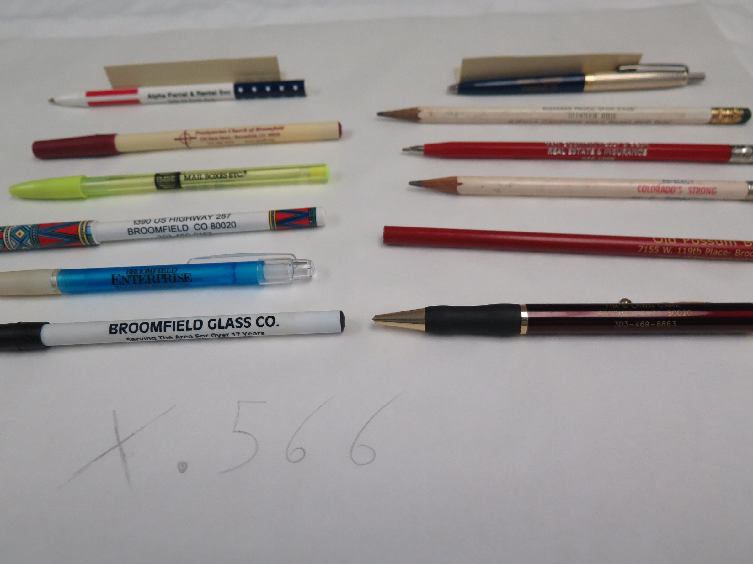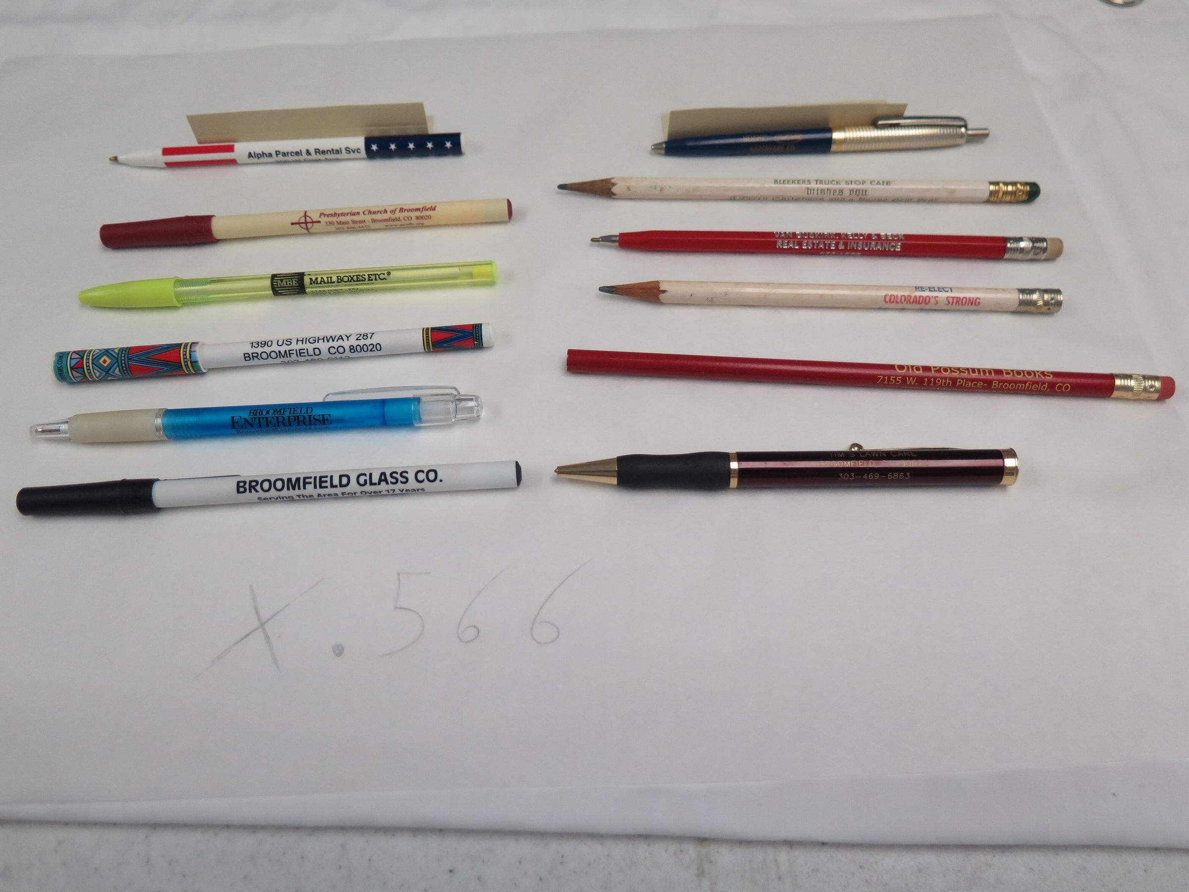 This is a set of 9 pens and 3 pencils from Broomfield businesses. Two of the pencils are wood with white paint. The third is painted red, and has not been sharpened. The pens are all ballpoint pens. One has red stripes and blue and white stars, 1 is tan with a red cap, 1 is yellow, 1 is white with a colorful pattern on the cap and at the end, 1 is blue and clicks open, 1 is white with a black cap, 1 is metal and blue, 1 is red and looks like a pencil, and 1 is red with a black grip. Each writing instrument measures about 7.5" (l) x 0.25" (dia).Lexicon