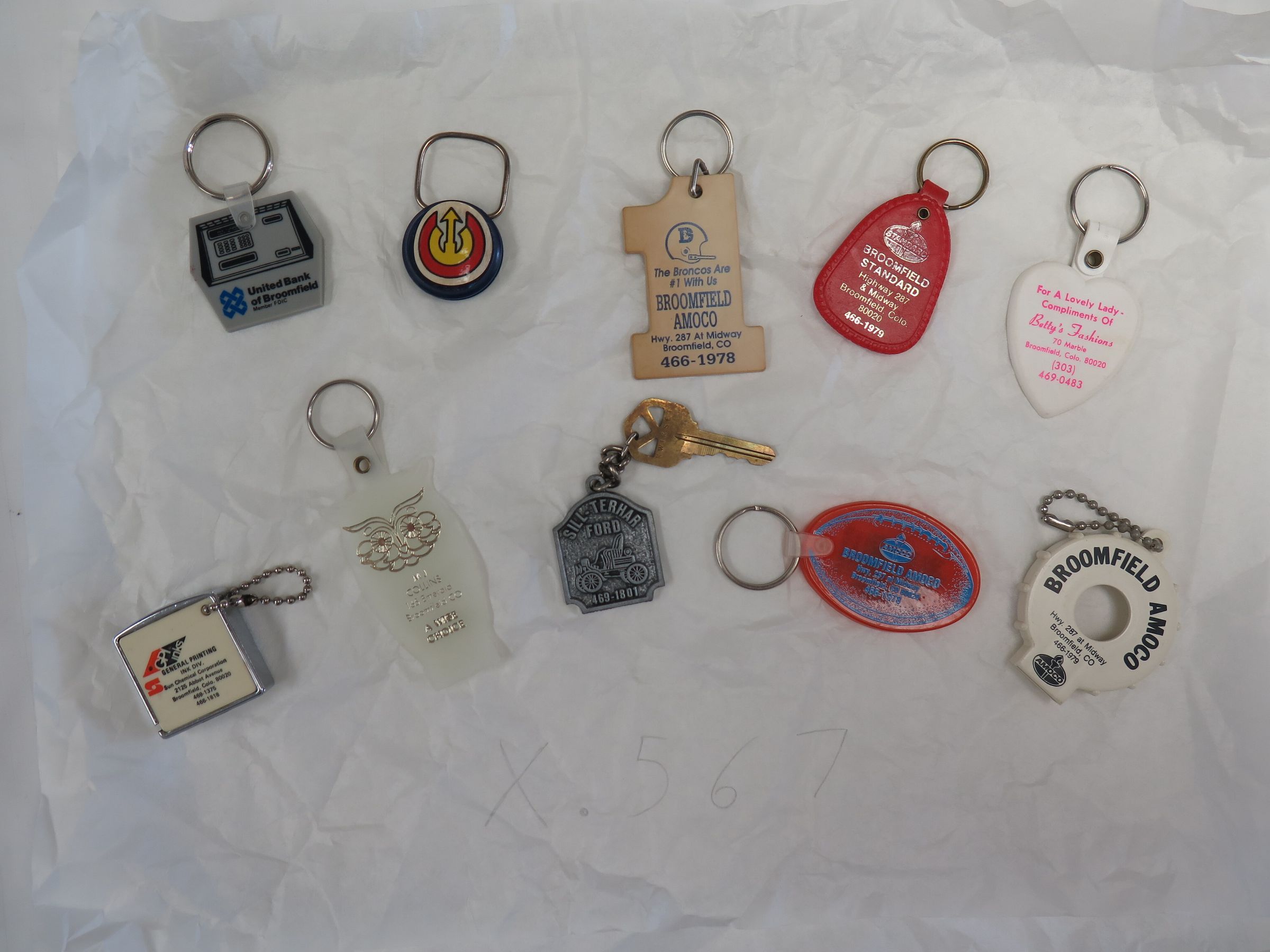 This is a set of 9 key chains from Broomfield businesses. One is from the United Bank of Broomfield, 1 is round with a black, white, red, and yellow pattern on it, 1 is from Broomfield Amoco, 1 is from Broomfield Standard, 1 is from Betty's Fashions, 1 is round and from Broomfield Amoco, 1 is red and from Broomfield Amoco, 1 is from Sill-Terhar Ford, 1 is from General Printing, and 1 is from MJ Collins. The average size is 3.5" (w) x 2" (l).Lexicon