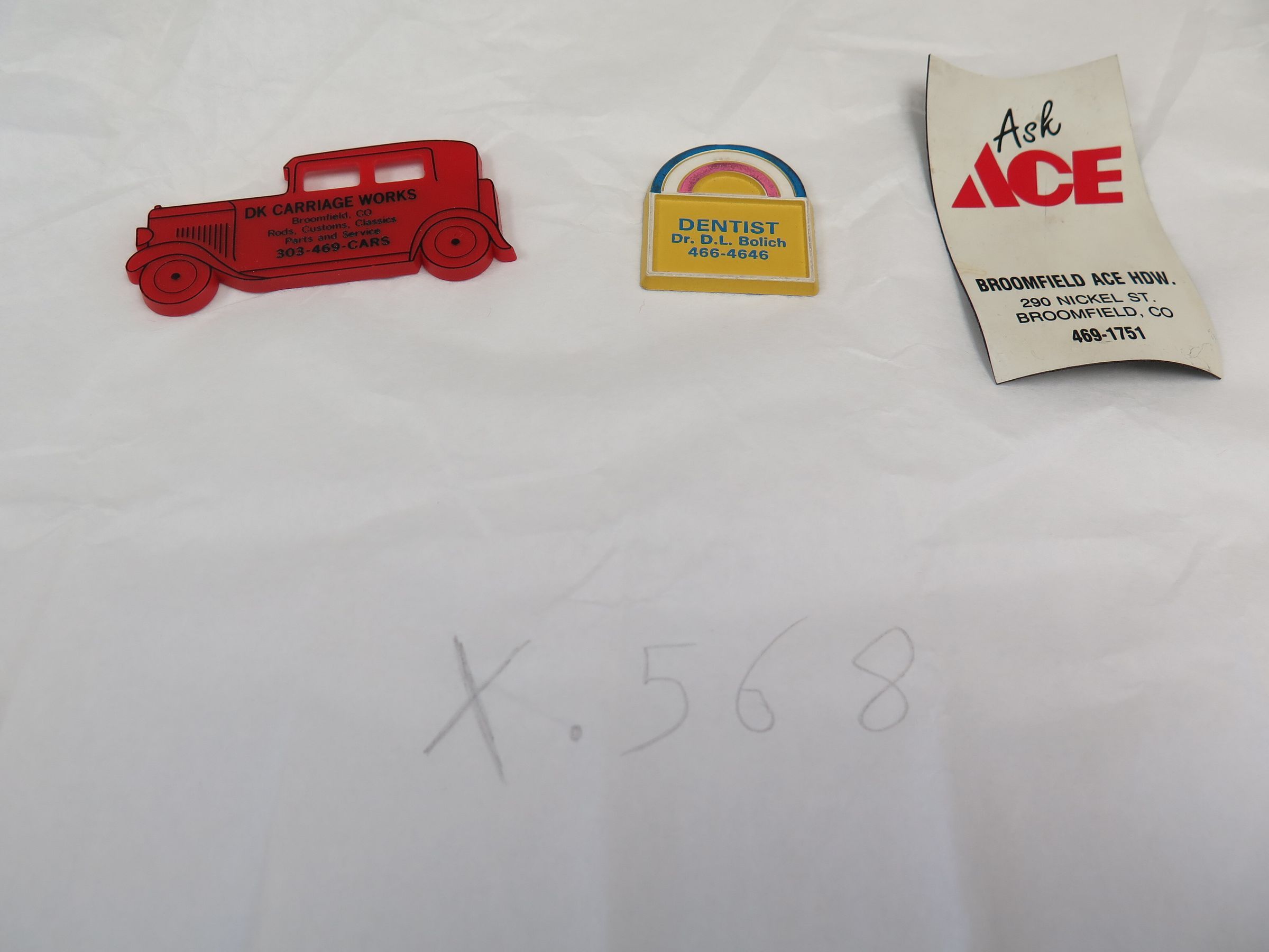 This is a set of 3 magnets from Broomfield businesses. One is a red car shaped magnet from DK Carriage Works. One is a yellow square with a rainbow on the top and the text "Dentist/ Dr. D. L. Bolich/ 466-4646". One is a rectangle from Ace Hardware. The average size of the magnet it 3" (w) x 1.5" (l).