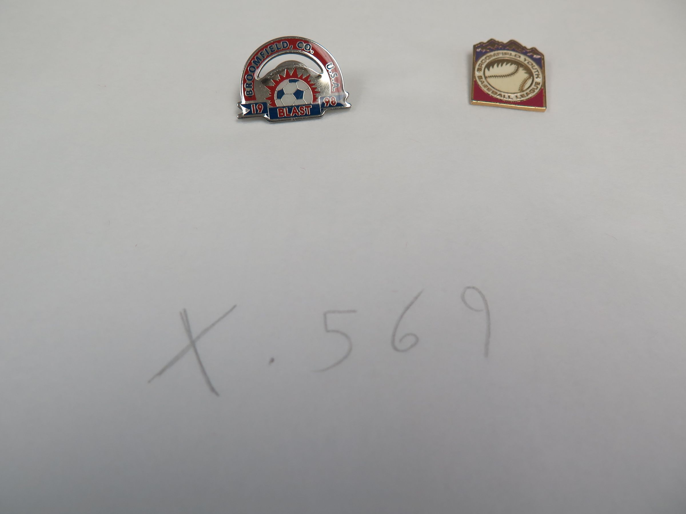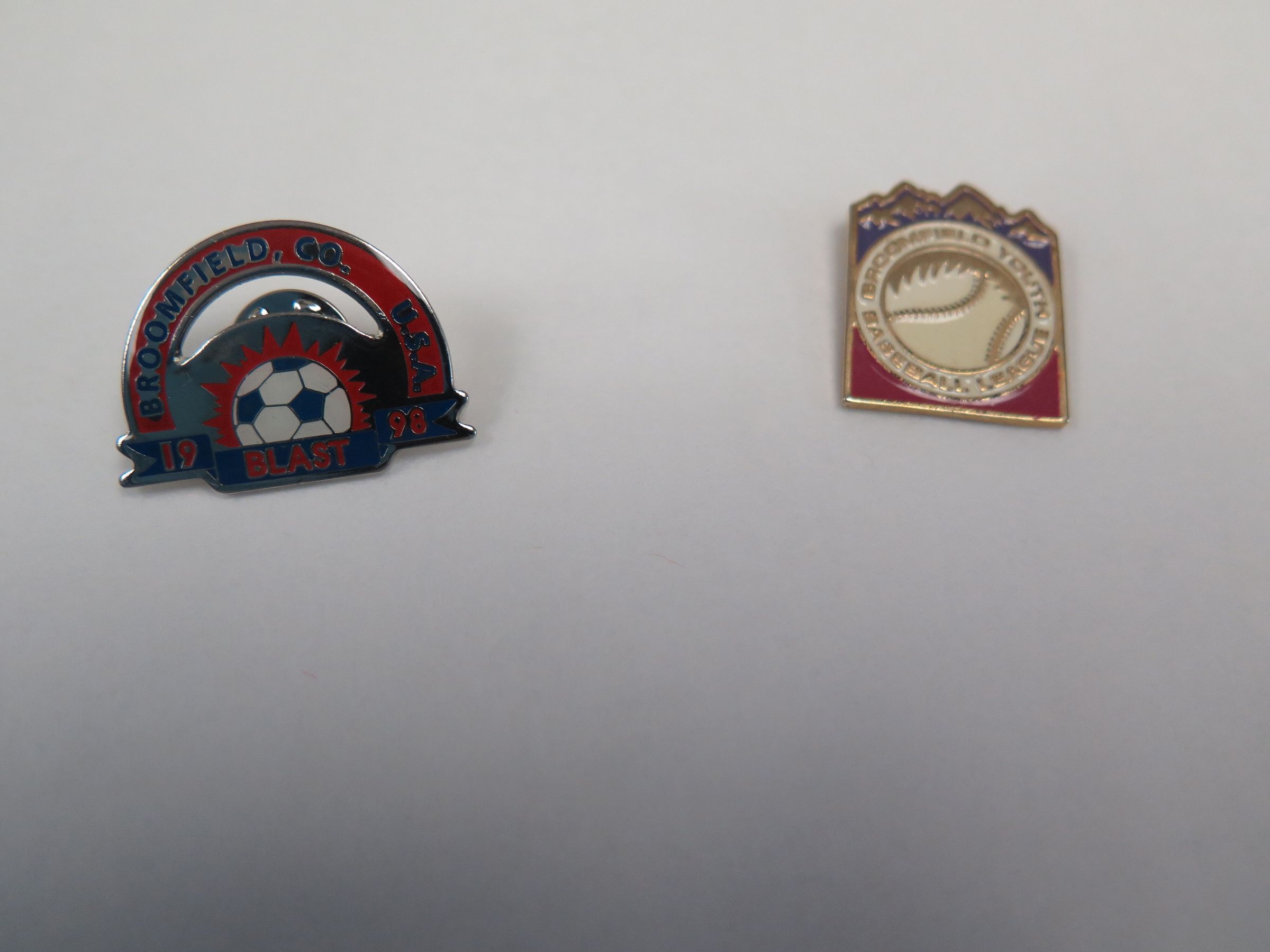 This is a set of 2 pins. One is a soccer pin from Broomfield. The other is a Broomfield Youth Baseball League pin. Each pin measures 1" (w) x 1" (l).