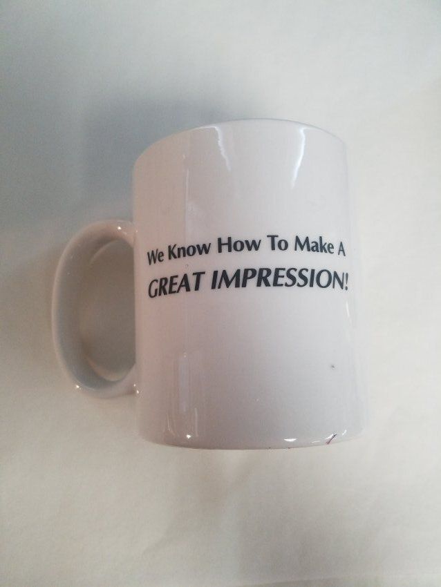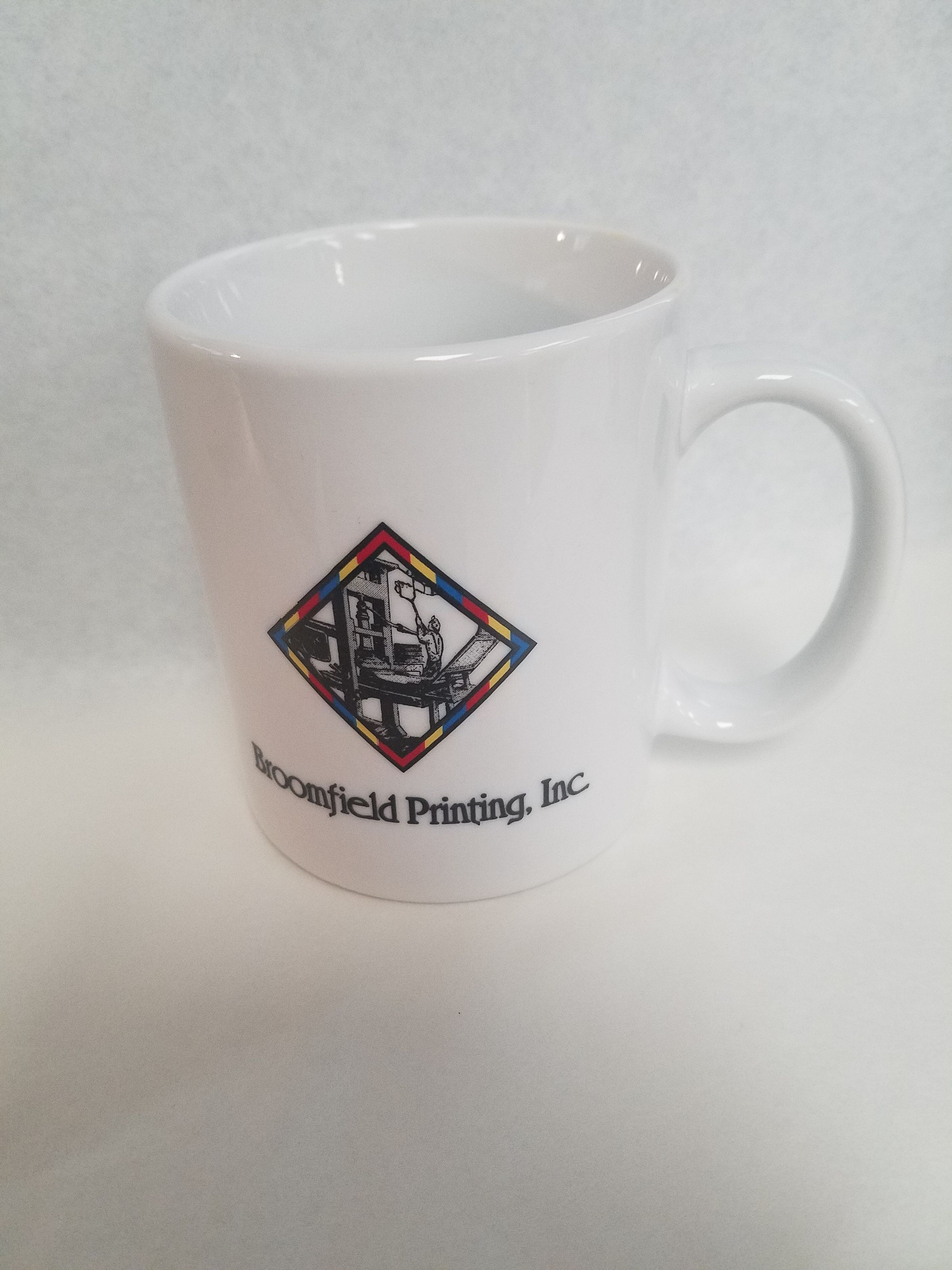 This is a white ceramic mug with a handle on the side. The mug has black text that reads, "We Know How to Make A Great Impression" on one side, and "Broomfield Printing, Inc." on the other. The mug measures 3.75" (h) x 4.25" (w) x 3" (l).Collection
