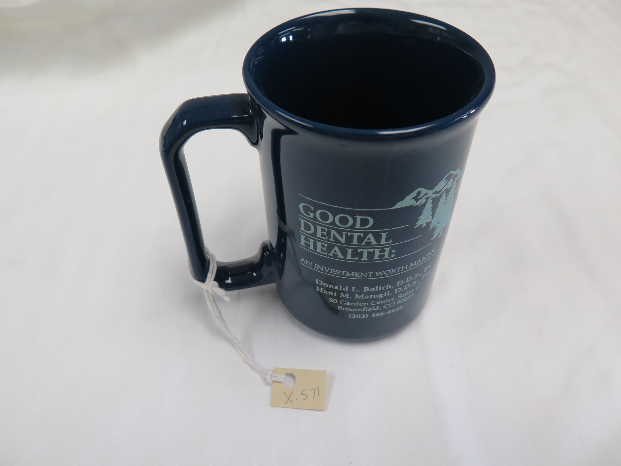 This is a black ceramic mug with a handle and white text on the side. The text reads, "Good Dental Health/ An Investment Worth Making/ Donald L. Bolich, D.D.S./ Hani M. Marogil, D.D.S./ 80 Garden Center, Suite 12/ Broomfield, CO 80020/ (303) 466-4646". The mug measures 4.5" (h) x 4.5" (w) x 3" (l).Collection