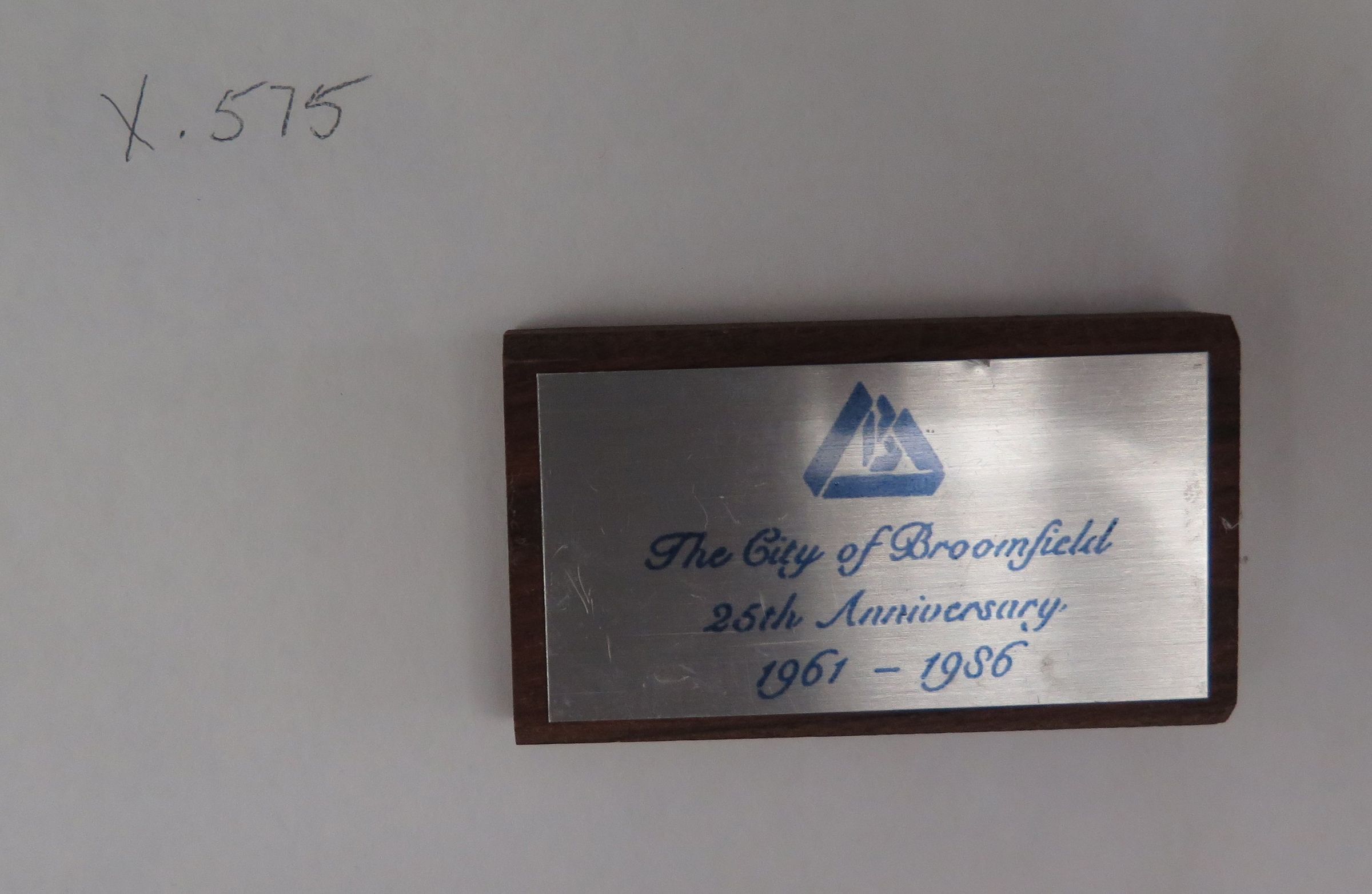 This is a metal placard for the 25th anniversary of the City of Broomfield. The text on the placard reads, "City of Broomfield/ 25th Anniversary/ 1961-1986". The placard measures 1.5" (h) x 3" (w) x 0.5" (d).