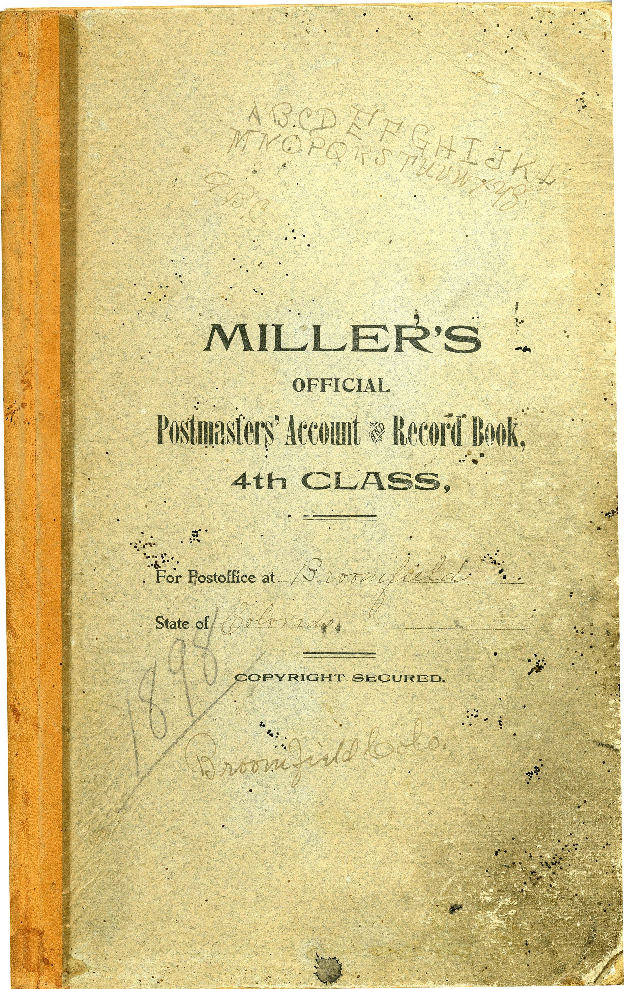 Postmaster's account and record book for the Broomfield Post Office, July 1898-December 1900. The book is 8.75" x 12.75" with a paper board cover and leather-covered adhesive and string binding. Contents of the book include: general accounting records; earnings records for stamps, postage, and envelopes; special delivery records; and US Treasury Department audit documentation. All records were created and recorded by Broomfield postmasters Harry Crawford and Florence A. Graves. Broomfield's post office was listed as "4th class," designating its size. The post office was considered part of Boulder County at the time of the records' creation.Collection