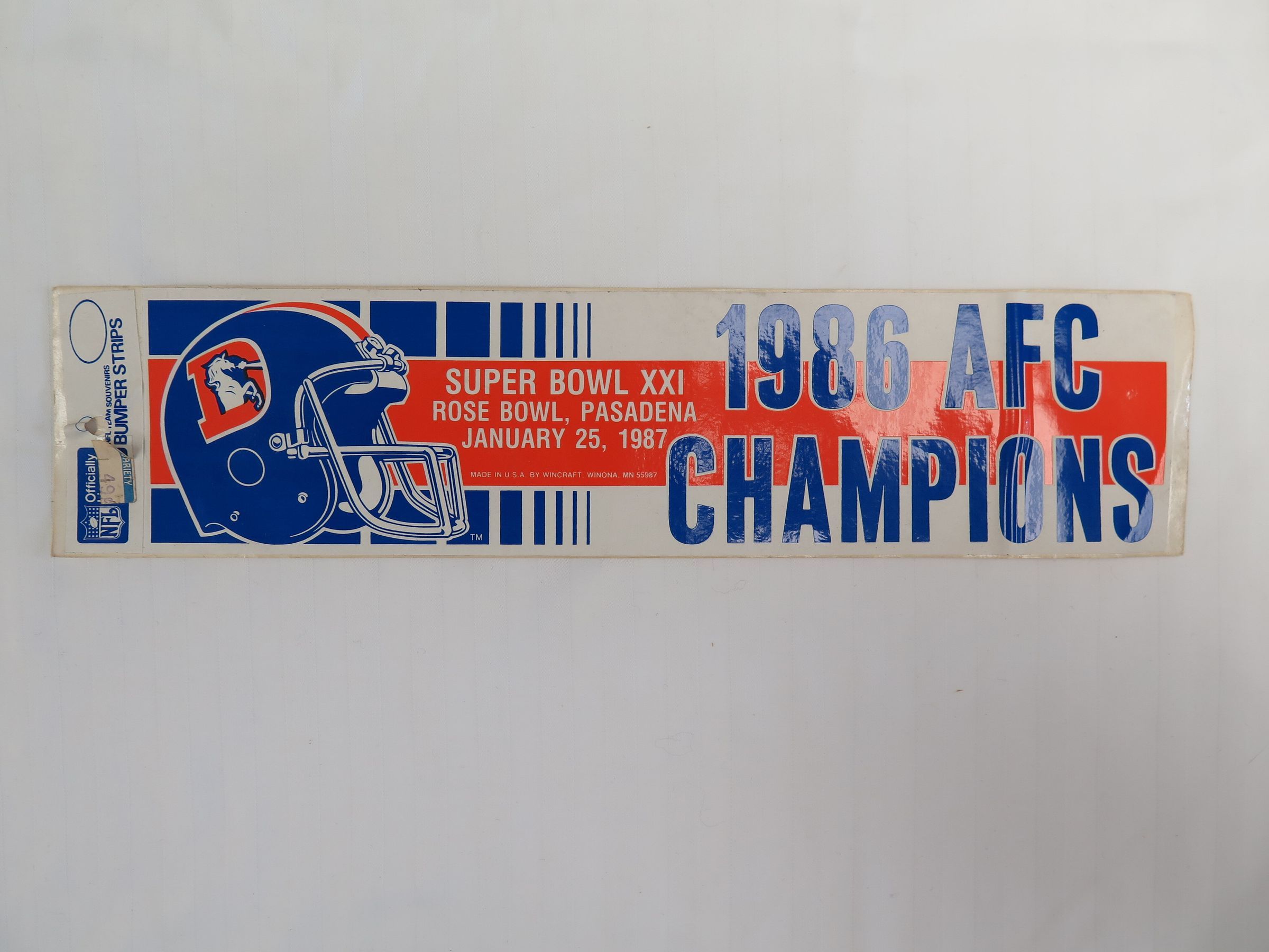 This is a bumper sticker commemorating the Broncos as the 1986 AFC champions. The sticker has text that reads, "Super Bowl XXI/ Rose Bowl, Pasadena/ January 25, 1987/ 1986 AFC/ Champions". The sticker measures 3" (h) x 12.5" (w).