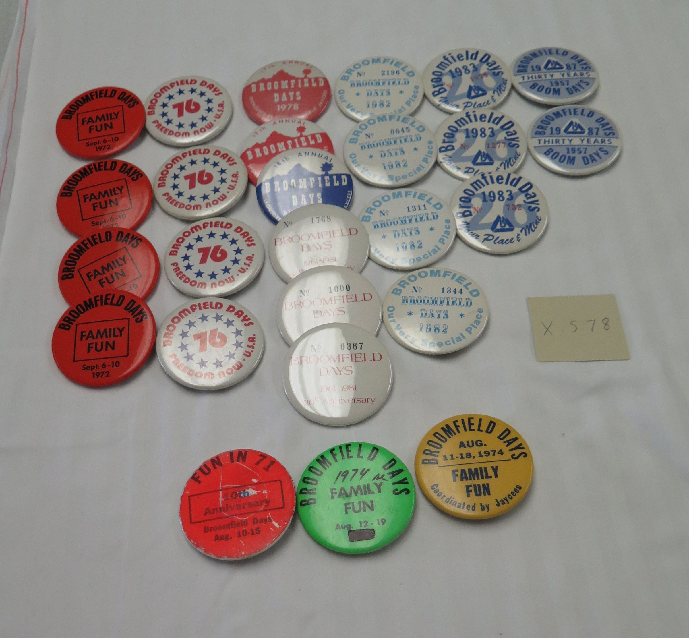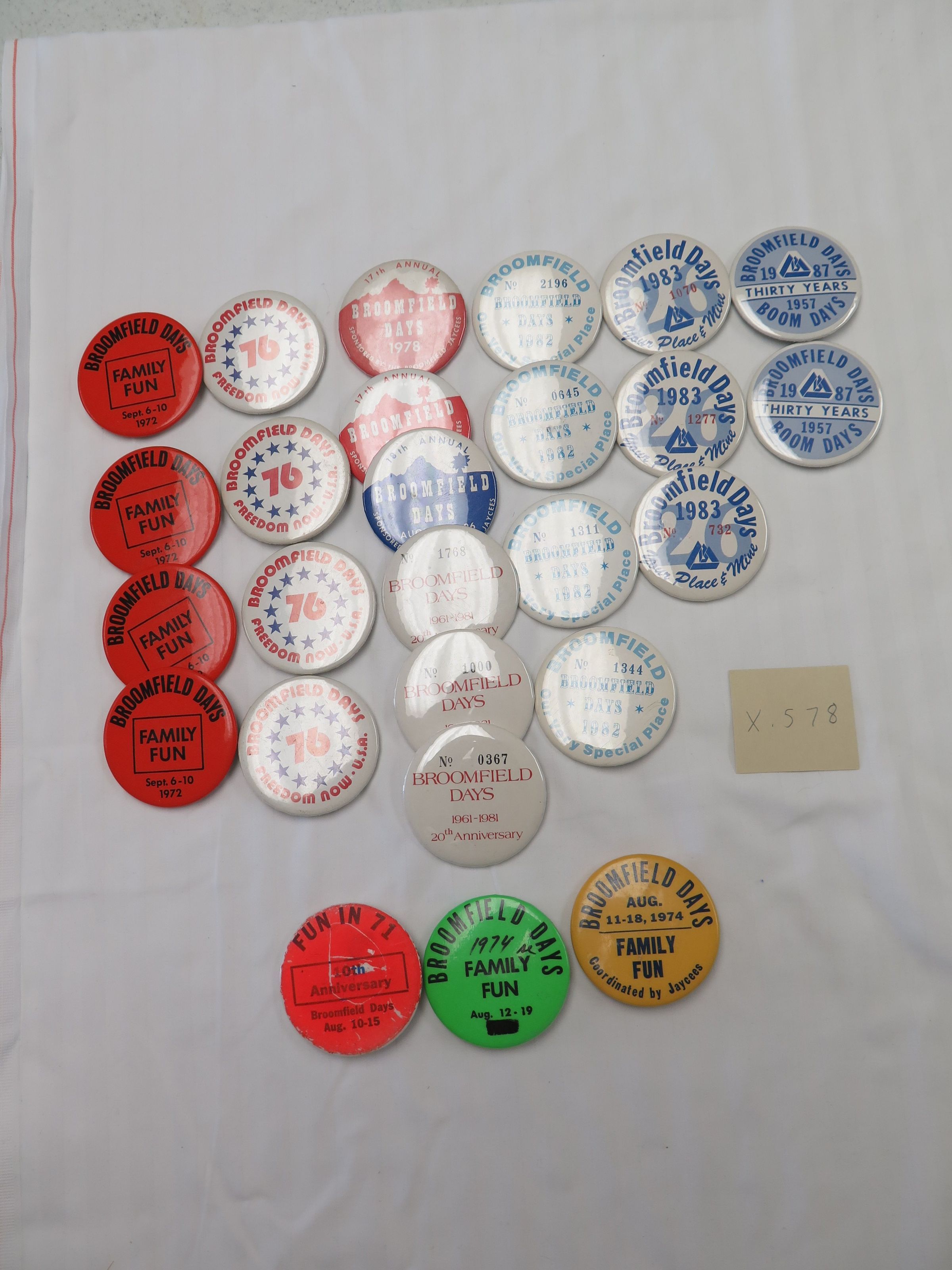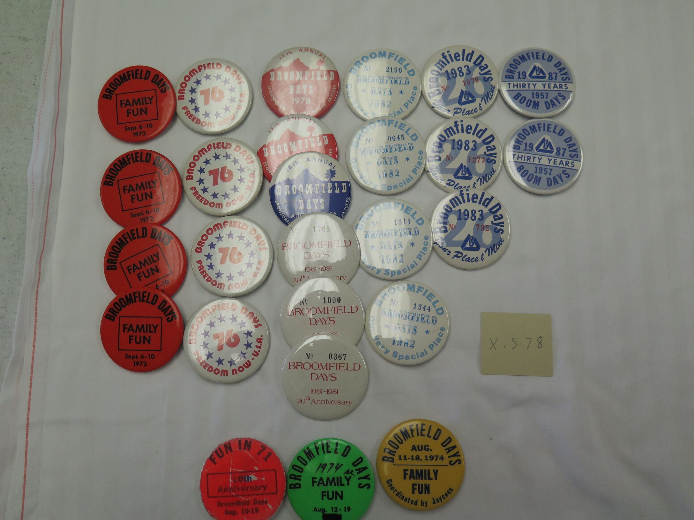 This is a set of 26 Broomfield Days Buttons. There is 1 button from 1971, 4 from 1972, 2 from 1974 (1 green and 1 yellow), 4 from 1976, 2 from 1978, 1 from 1979, 3 from 1981, 4 from 1982, 3 from 1983, and 2 from 1987. The buttons each measure 2.25" (dia).Made/Created