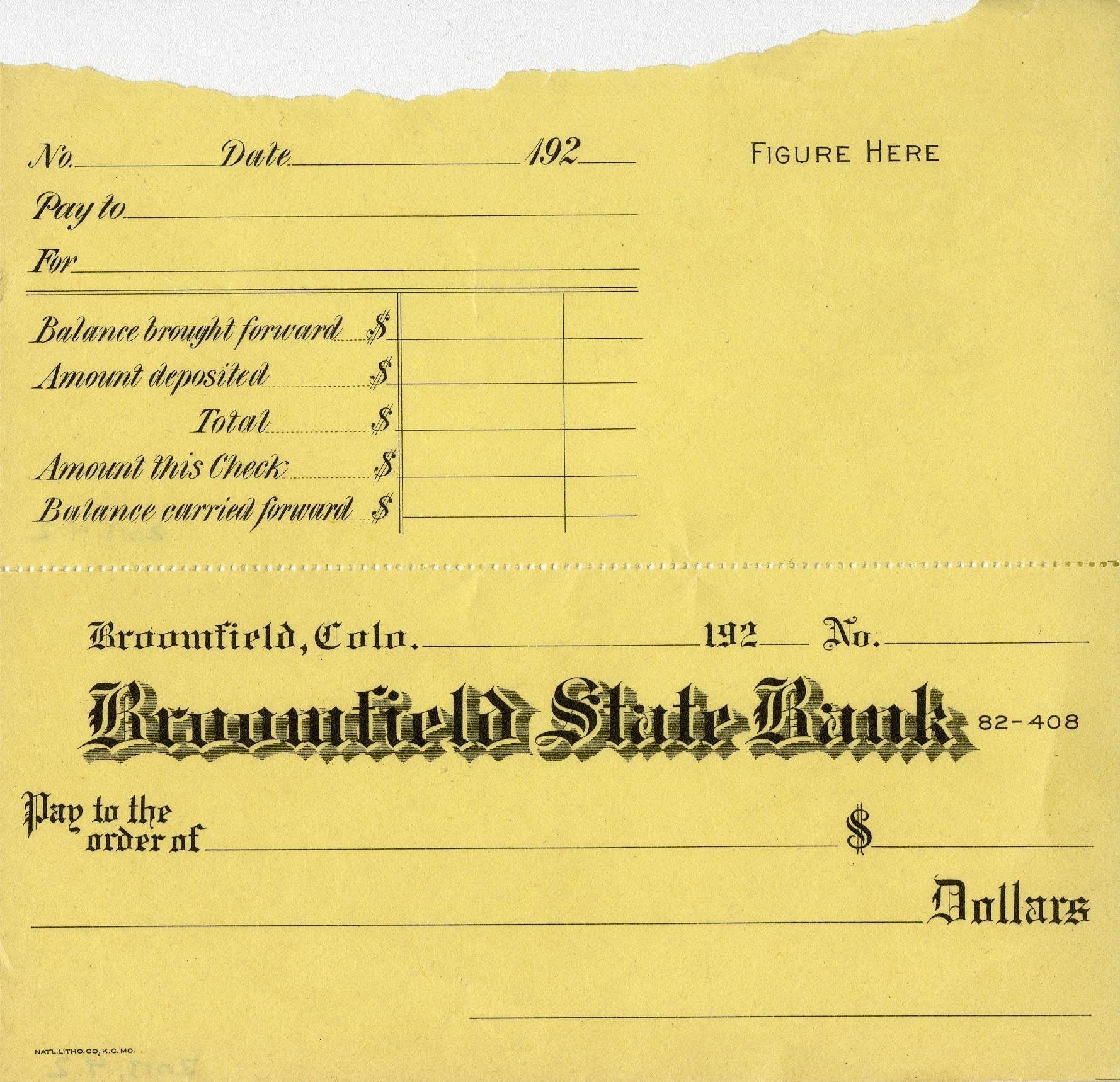 A blank check for Broomfield State Bank, circa 1920s. The check is 5.5" x 6", with two parts connected along a dotted line for ripping; one half is the check, the other a check receipt. It is torn along the top section. The bank opened around 1920, but closed in the 1930s during the Great Depression.Collection