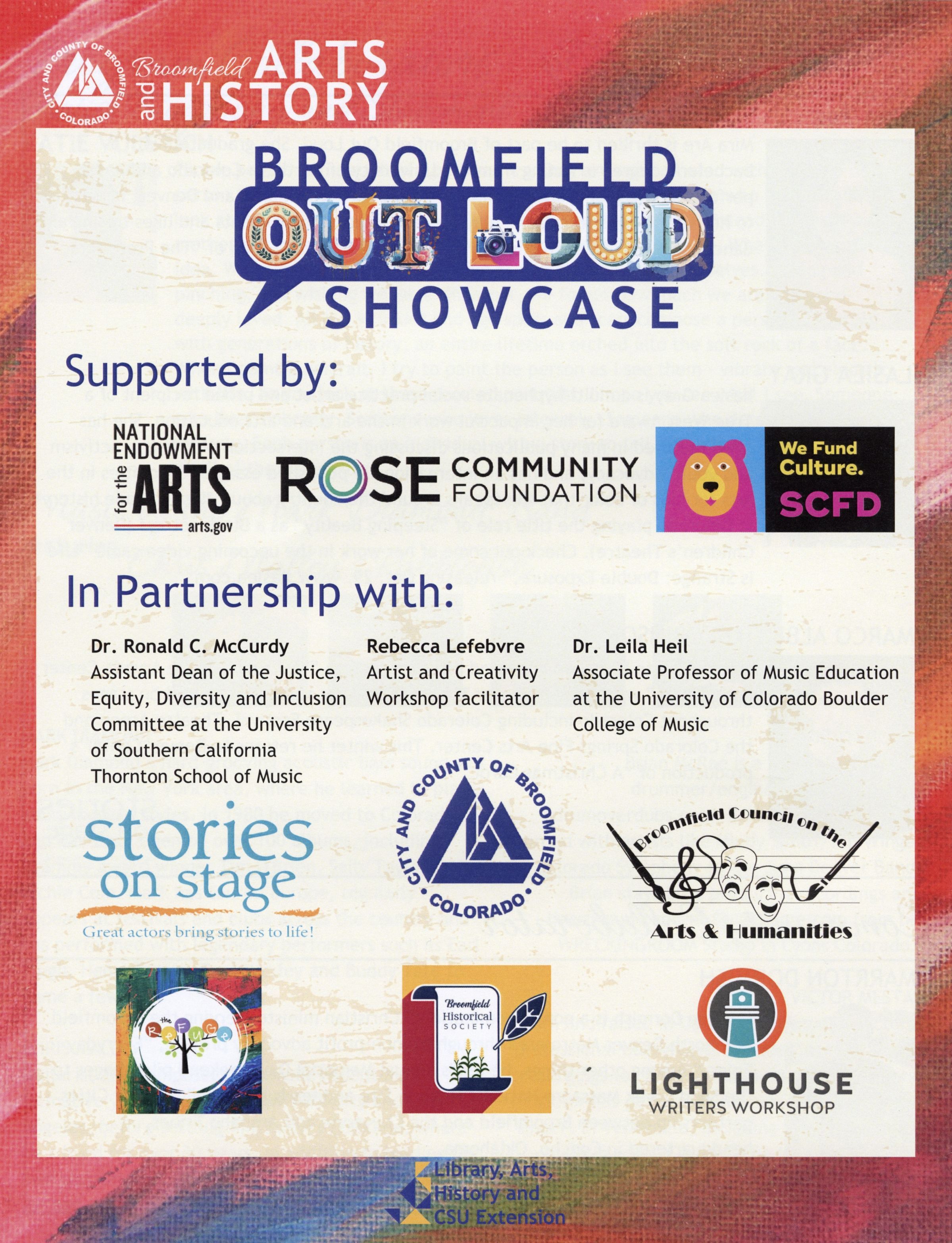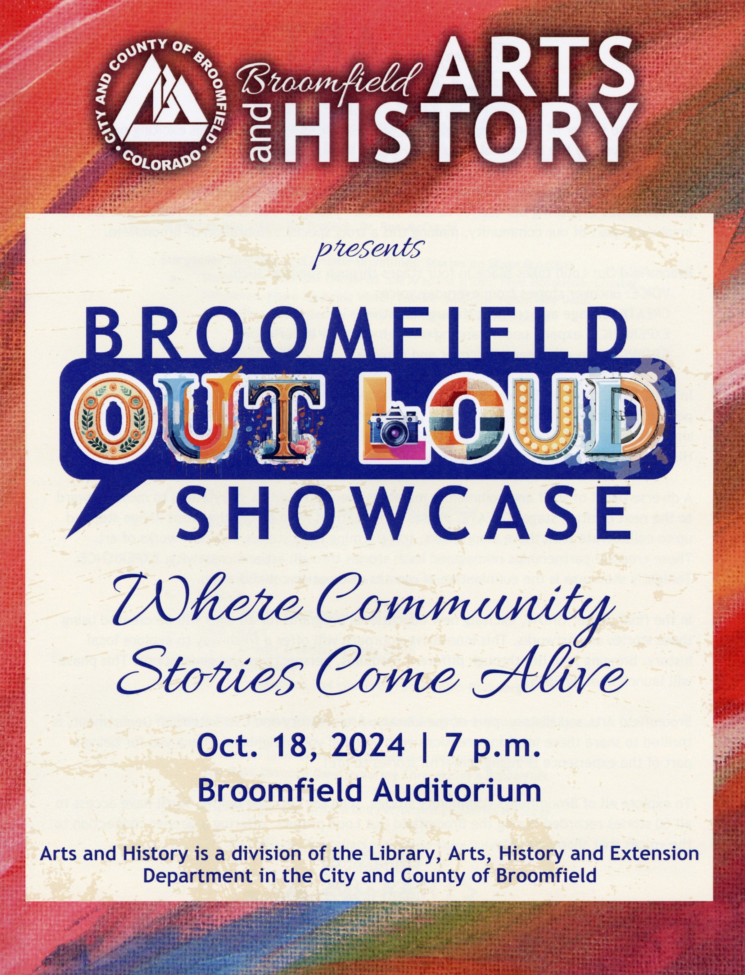 (a) Item is a catalog from the Broomfield Out Loud Showcase. The cover of the magazine is red and features the Broomfield Arts and History logo at the very top. The title, "Broomfield Out Loud Showcase" is printed on the front cover above the words "Where Community Stories Come Alive," as well as information about the event, which occurred on October 18, 2024 at 7 p.m. in the Broomfield Auditorium. The back cover features a list of sponsors.