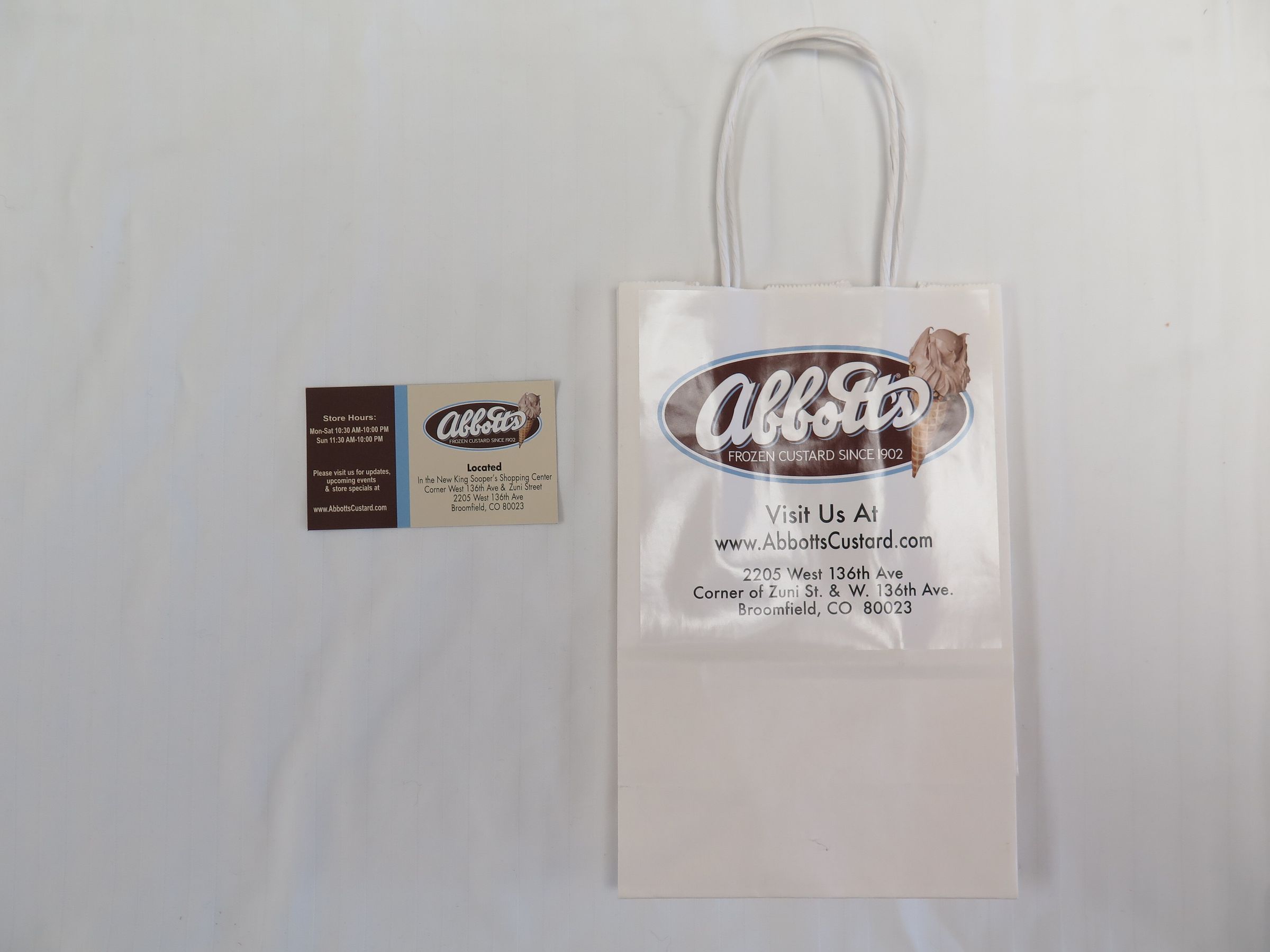 This is a small white Abbott's Frozen Custard bag with a magnet inside. The magnet has the store hours printed on it. The Abbott's store was located at 2205 West 136th Ave/ Corner of Zuni St. & W. 136th Ave./ Broomfield, CO 80023. The bag measures 8.5" (h) x 5.5" (w).