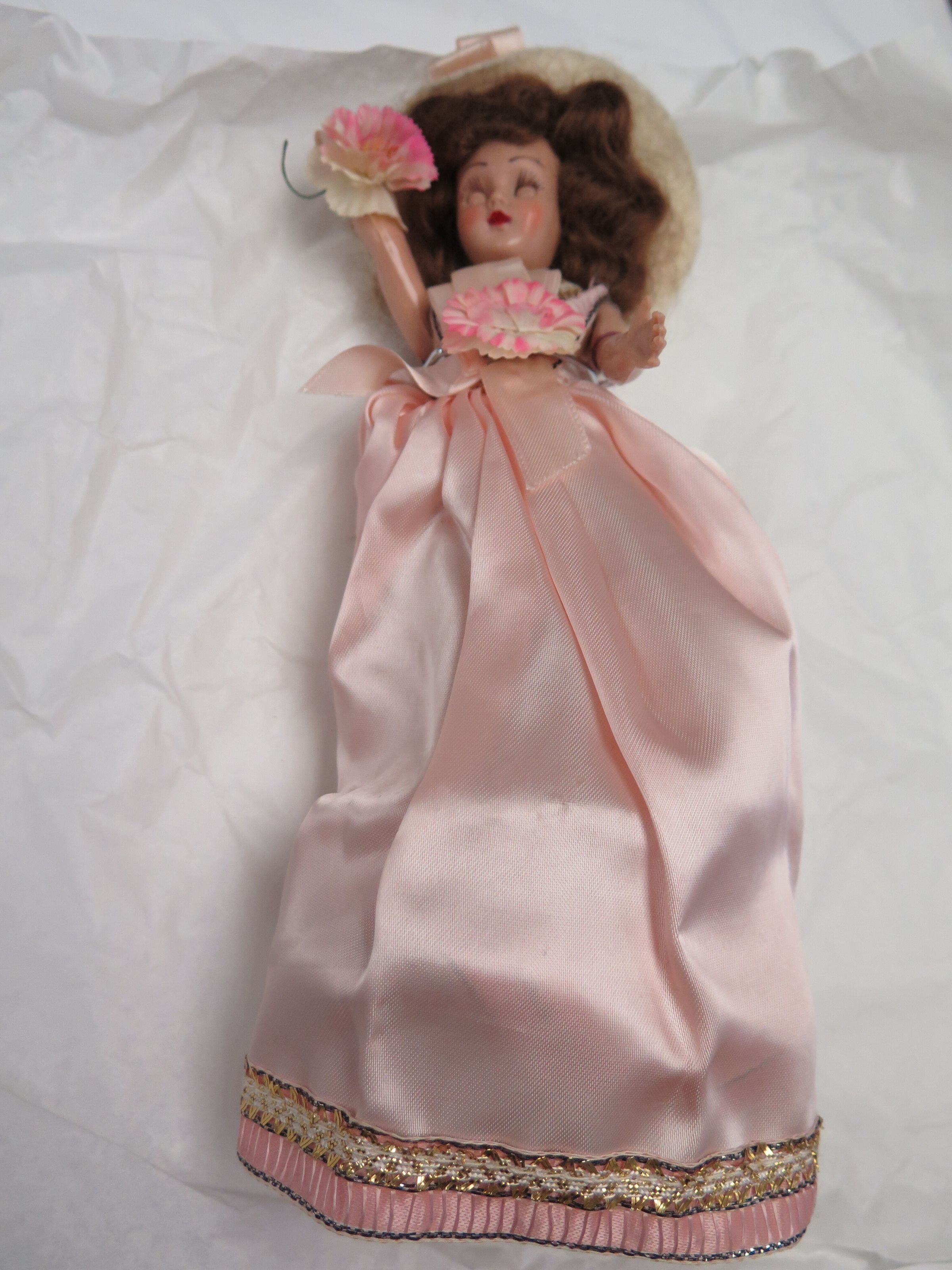 This is a doll in a pink dress and a white hat with pink ribbon. The doll has pink flowers in her right hand and on her dress. The dress has gold, black, and darker pink decoration at the hem. The doll has brown hair and sleep eyes. The doll measures 10.75" (h) x 4" (w) x 3" (d).Collection