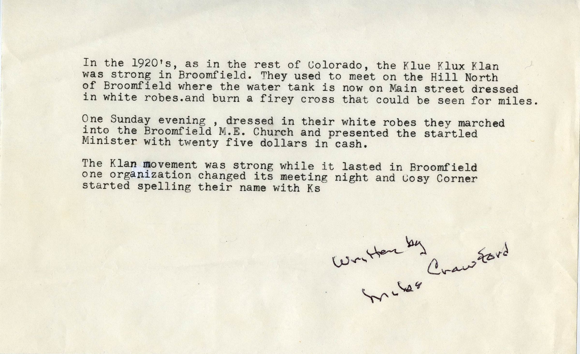 Miles Crawford's written memories of the Ku Klux Klan in Broomfield during the 1920s, written circa 1950. The writing is one half page, typewritten. Crawford remembers how the Klan would meet and burn crosses, and one occasion where Klansmen presented the minister of Broomfield M.E. Church with cash during a Sunday service, with other memories. The writing is signed in pen as "Written by Miles Crawford."Collection