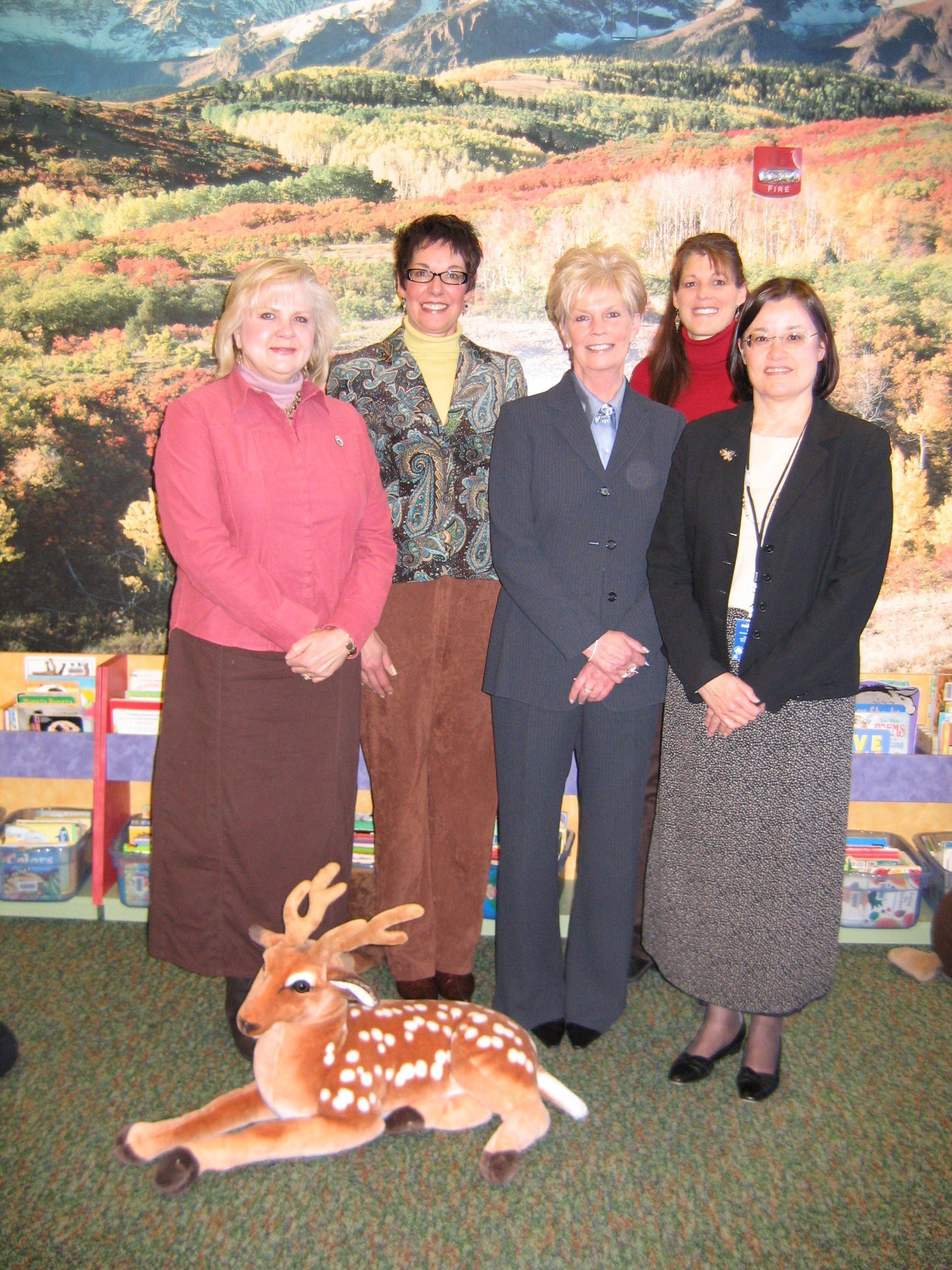 The first photograph is of a blonde woman, approx. 35-45 years of age, reading to a group of sitting children. The second photograph is a portrait of five women, four of them unknown, but the woman furthest to the right is Roberta Depp.Photograph Details
