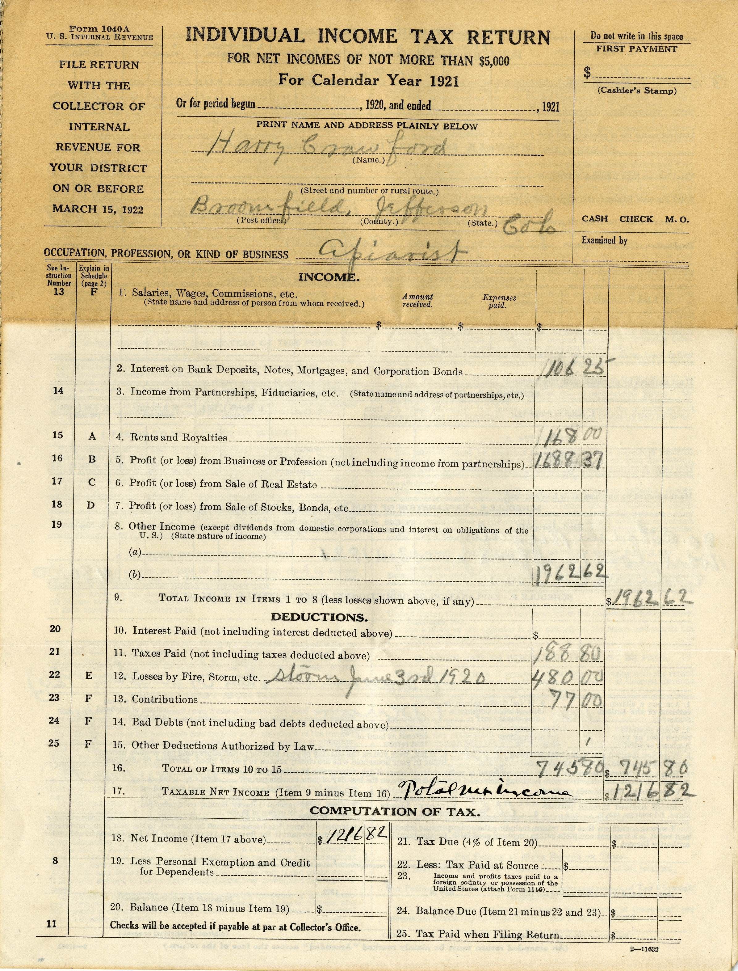 Harry Crawford Income Tax Return for 1921 with envelopeEntry/Object ID