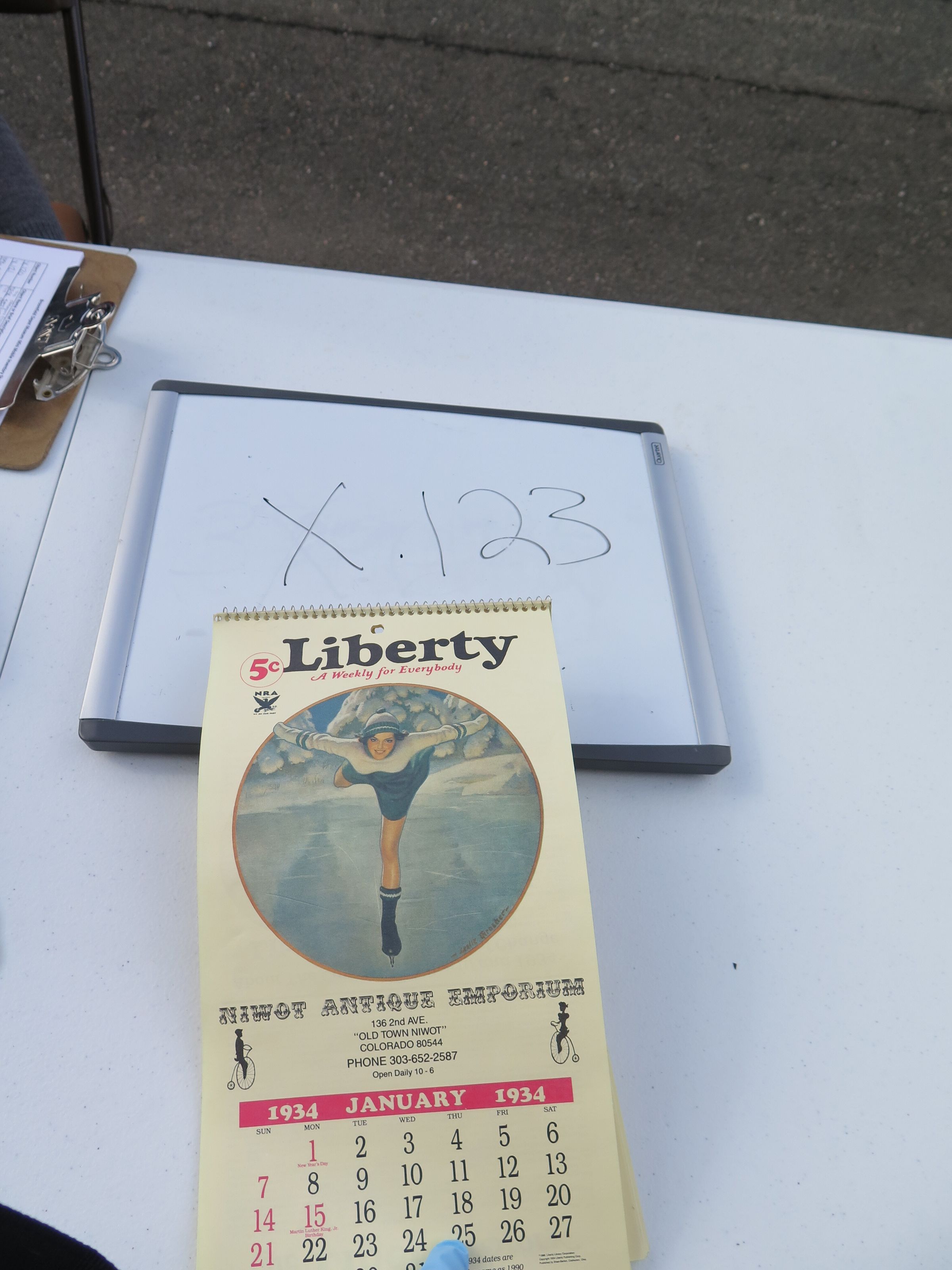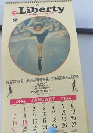 This is a reproduction paper calender from 1934. The calender was purchased at Niwot Antique Emporium. The calendar is Liberty brand with "A Weekly for Everybody" printed at the top.