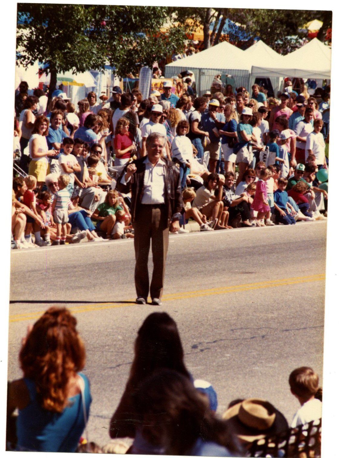 Item is a photograph printed on Kodak paper taken during the 1989 Broomfield Days event. In the photo, crowds have gathered on both sides of the street to view a man who is walking down the center of the road. He is grinning and has gray hair. He is wearing black pants and a jacket over a white button-down shirt. White tents hosting other festivities are visible beneath the trees in the background.Photograph Details