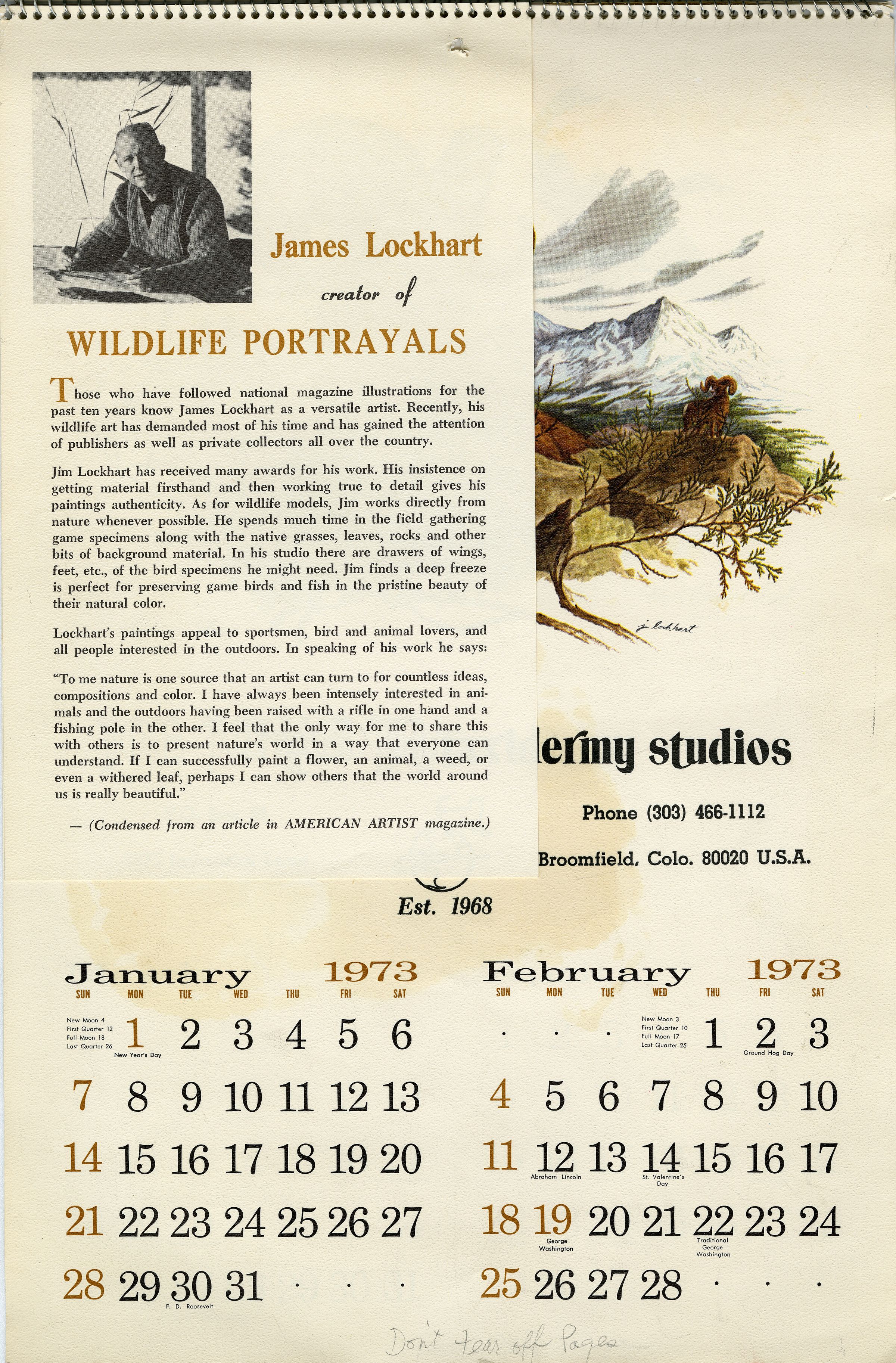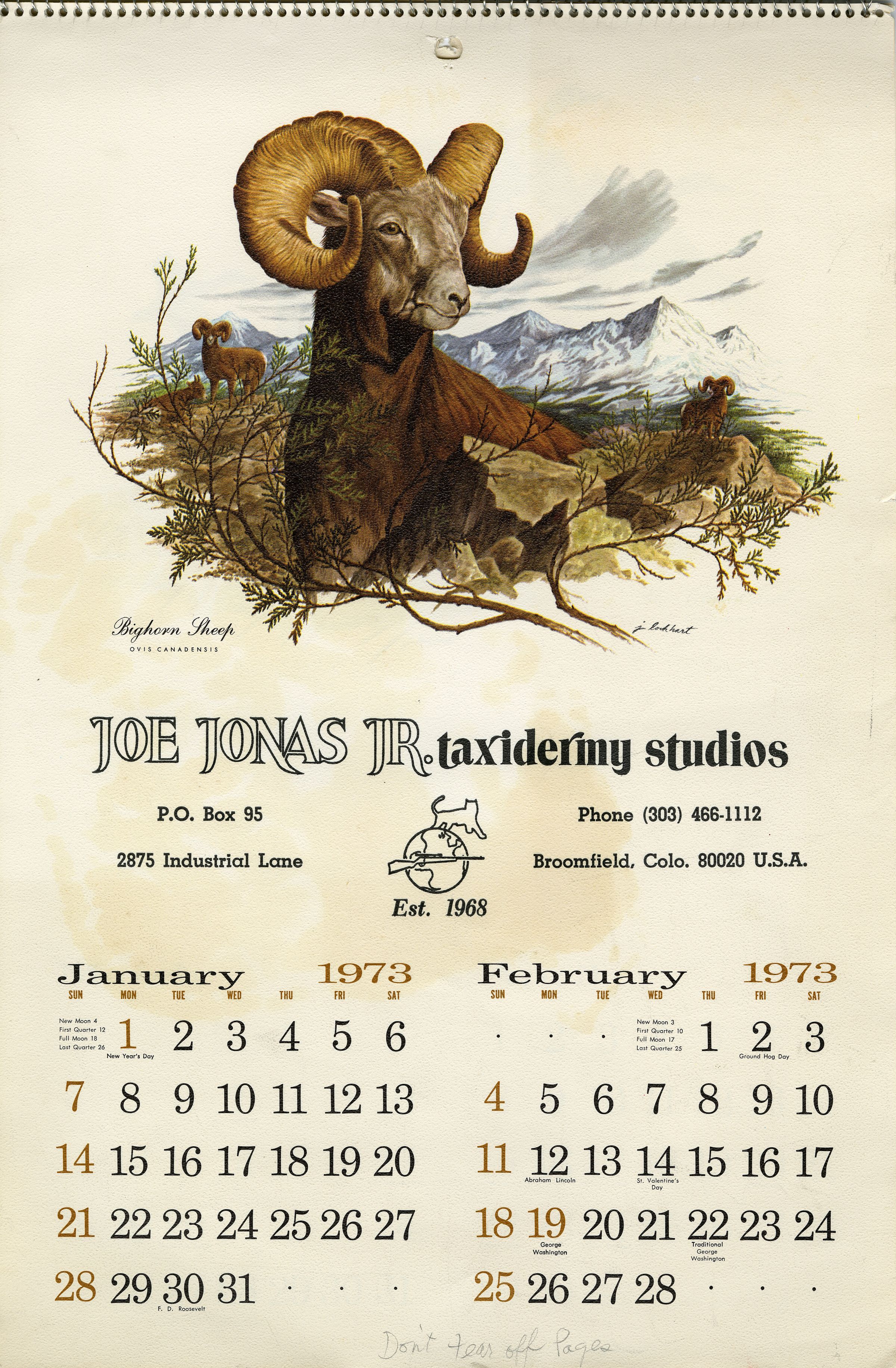 A calendar for Broomfield business Joe Jonas Jr. Taxidermy Studio, 1973. The calendar is 9.25" x 16" with wire spiral binding at the top. Each of its six pages shows two months, with a color illustration of wildlfe by artist James Lockhart. A bio of Lockhart is included on a small leafllet bound to the front of the calendar.