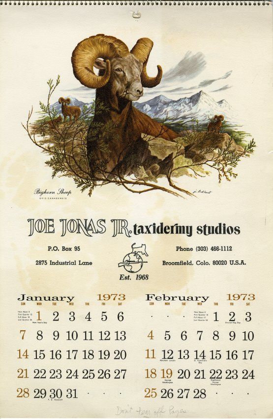 Custodial History: Donated to the Broomfield Depot Museum by Eleanor Collins in 1984. The calendar was originally distributed by the business it advertised, Joe Jonas Jr. Taxidermy Studios.