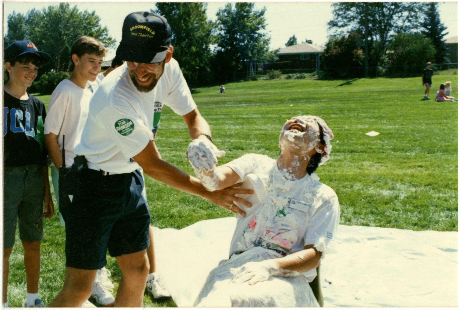 Item is a colored photograph taken during the 1990 Broomfield Days celebration. In this photograph, Bob Schulze is visible to the left, wearing a white t-shirt, baseball cap, and navy shorts, laughing as he grabs the arm of Bob Sakaguchi and shoves a cream pie onto his shirt. Sakaguchi is sitting on a white tarp and is laughing as well, covered in the remnants of countless other pies. Two kids standing behind Schulze are watching, and other children are playing in the grassy field that makes up the background of the photo. Some homes and tall trees complete the background. Schulze was the mayor of Broomfield from 1981 to 1993 when his term expired, and Sakaguchi was a former Broomfield councilman.Photograph Details