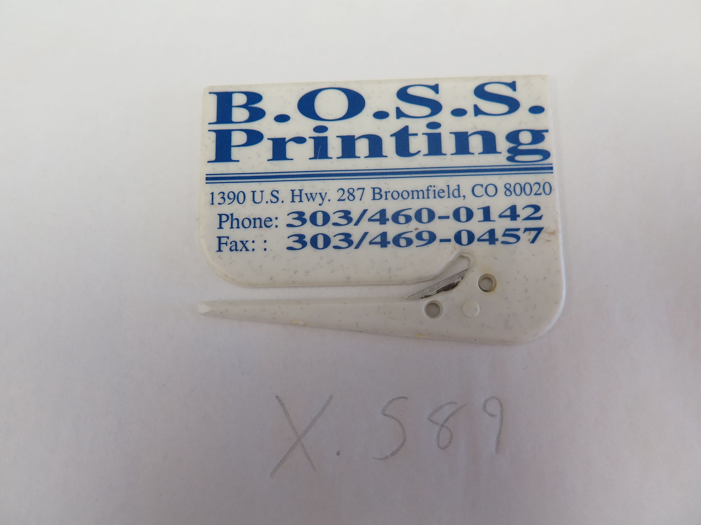 This is a white plastic letter opener with a metal blade and blue text on the front. The text reads, "B.O.S.S./ Printing/ 1390 US Hwy. 287 Broomfield, CO 80020/ Phone 303/460-0142/ Fax 303/460-0457". The letter opener measures 3.25" (w) x 2.25" (l).