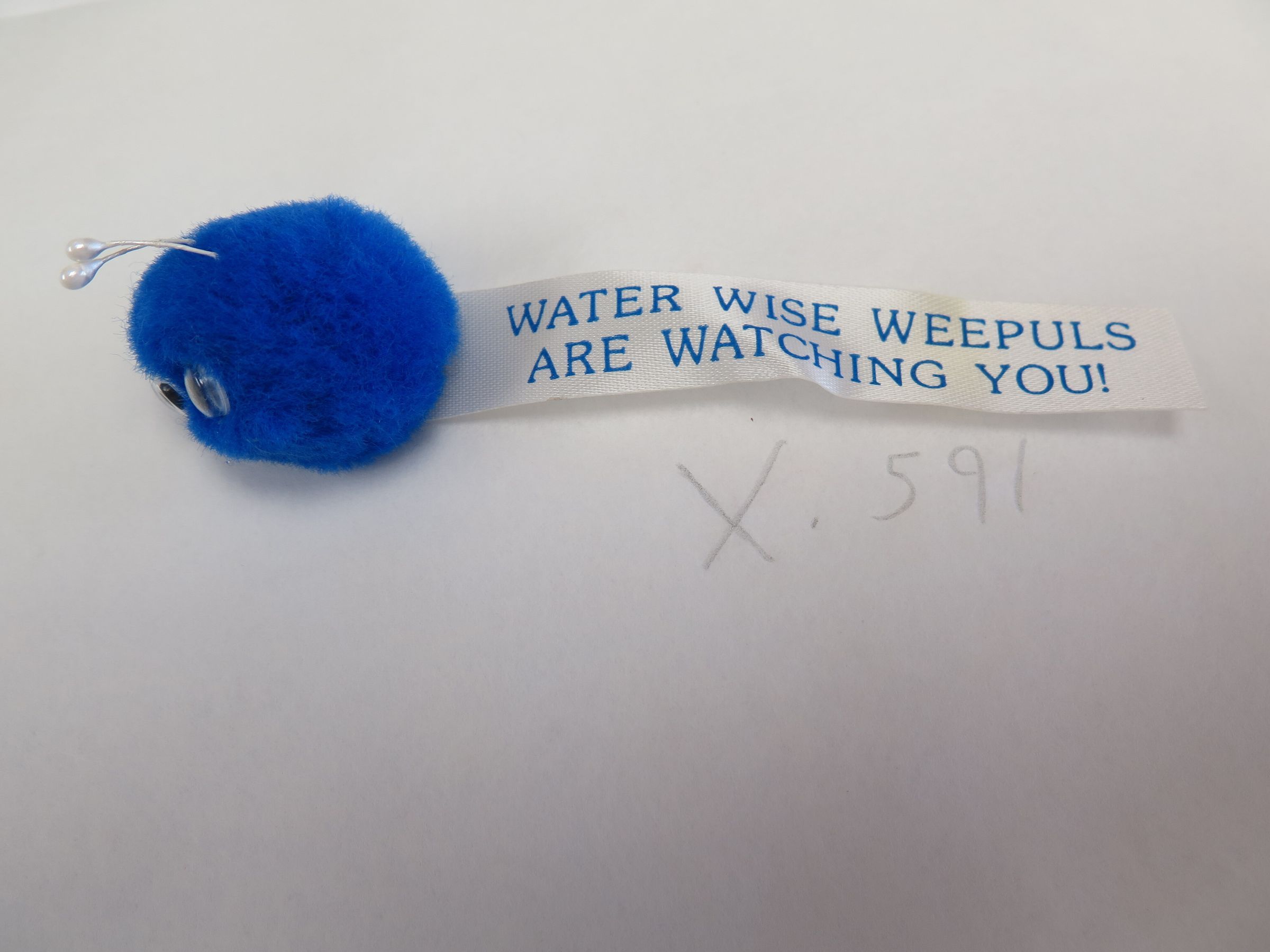 This is a blue cotton ball with googly eyes and a piece of ribbon glued to it. The ribbon is white with blue text that reads, "Water Wise Weepuls/ Are Watching You!" The whole advertisement measures 1" (h) x 0.5" (w) x 5" (l).