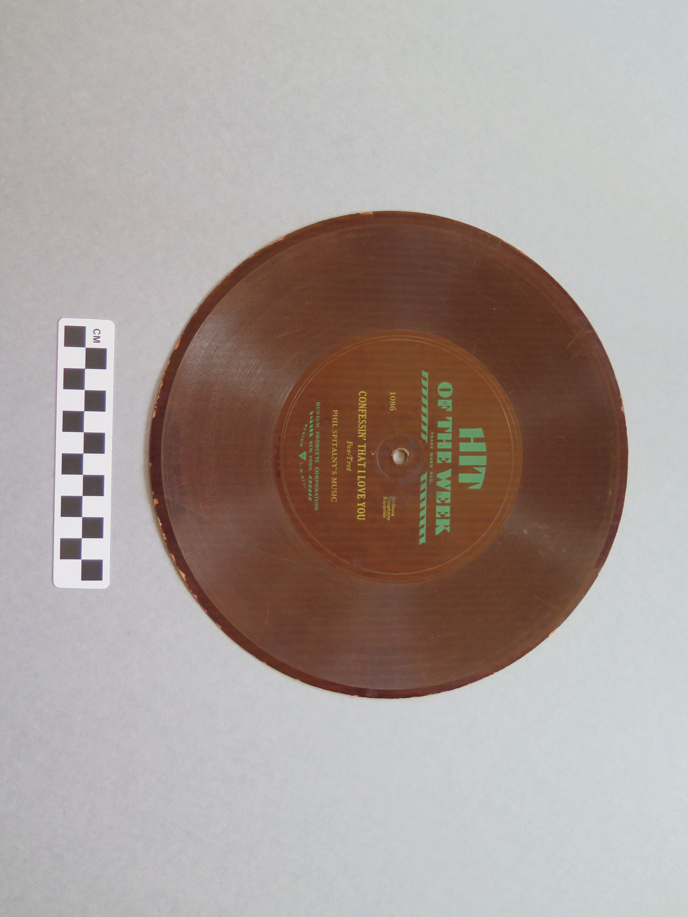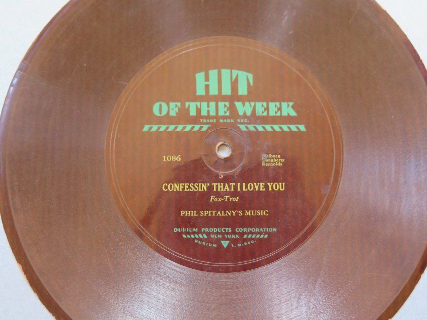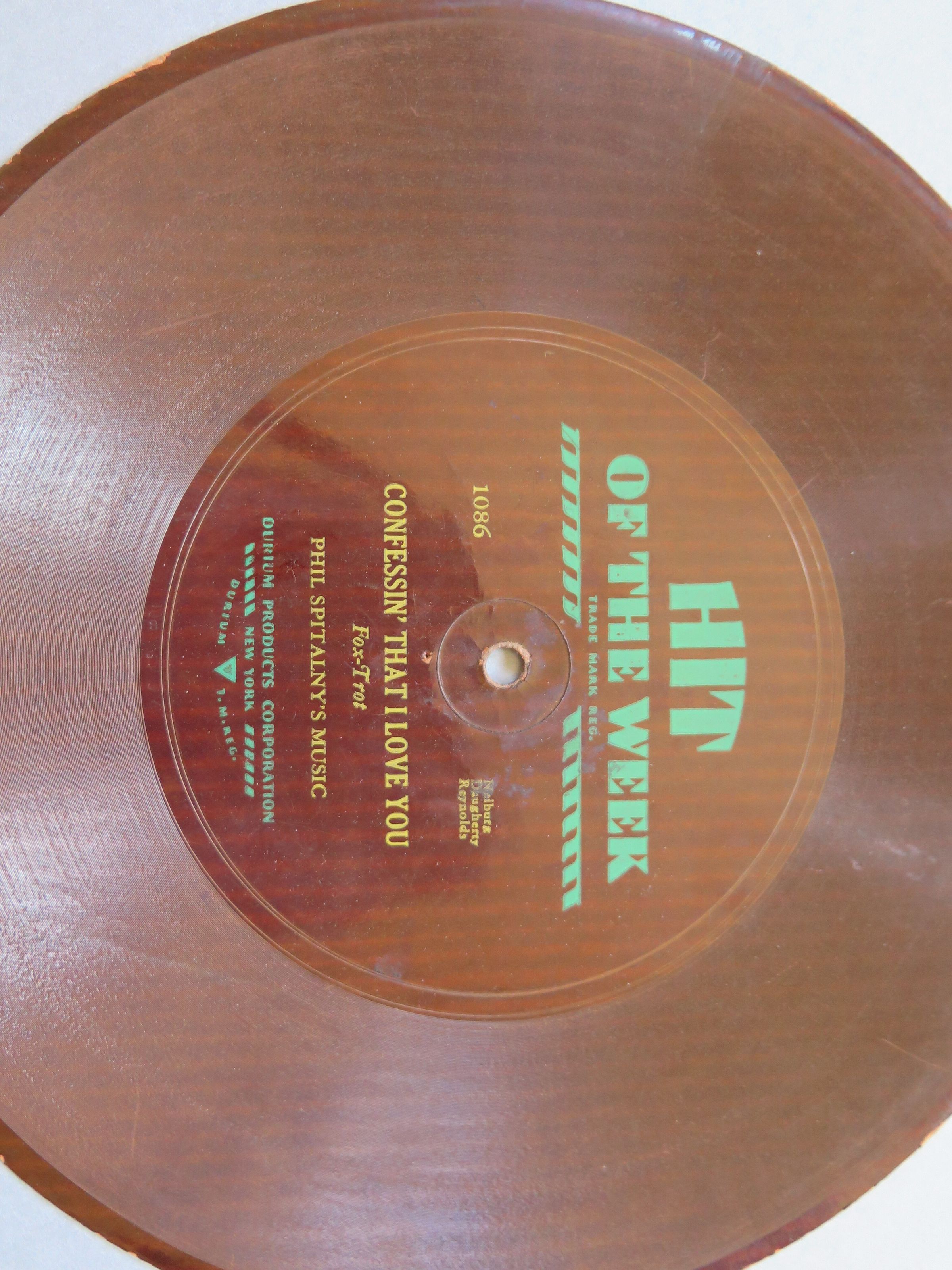This is a single-sided paper gramophone record for the single Confessin' That I Love You. The record face is brown, and the back is red paper. The text printed on the record label reads, "HIT/ OF THE WEEK/ TRADE MARK REG./ 1086 Neiburg Daugherty Reynolds/ CONFESSIN' THAT I LOVE YOU/ Fox-Trot/ DURIUM PRODUCTS CORPORATION NEW YORK/ BURIUM T. M. REG.".Collection
