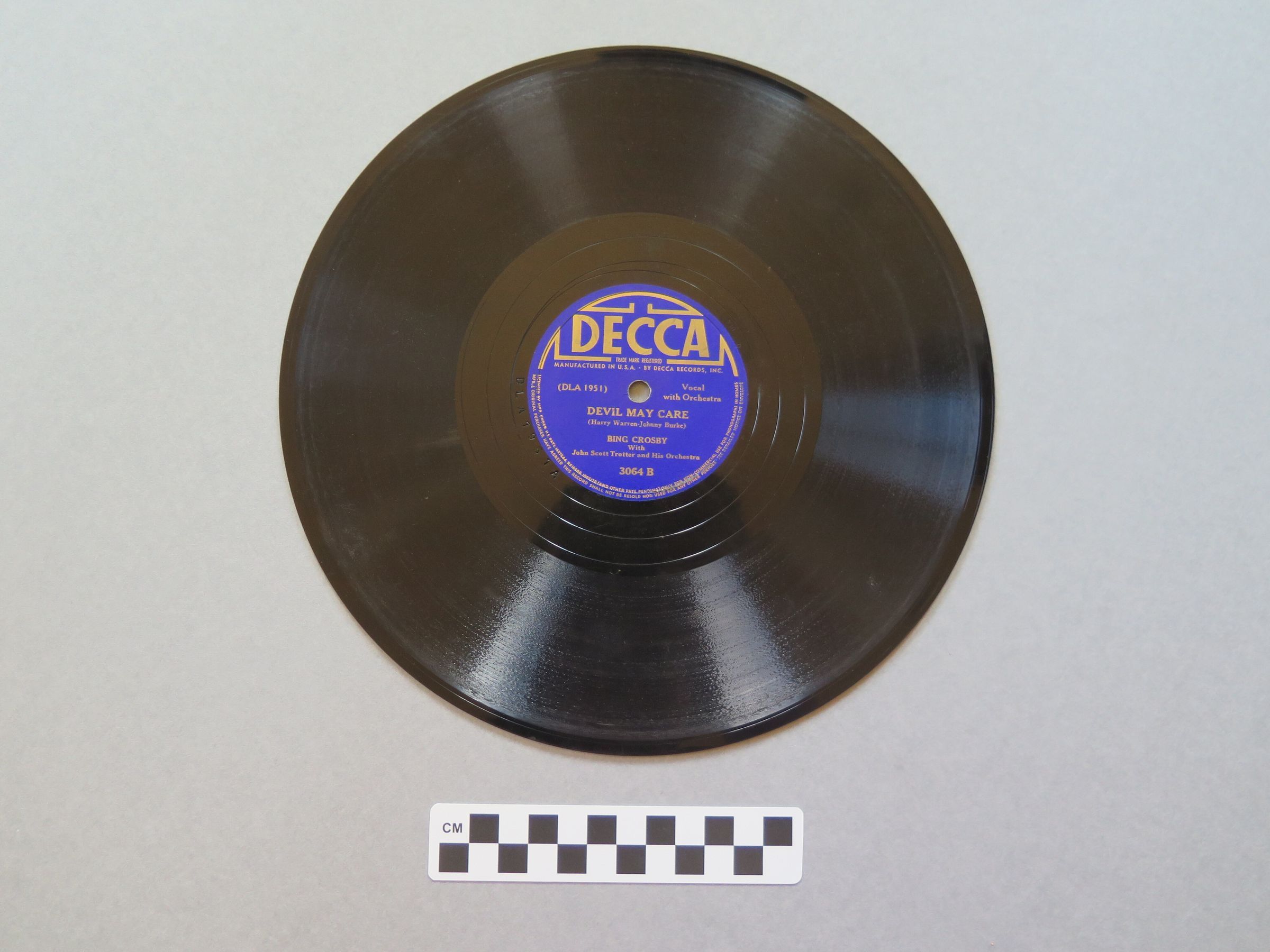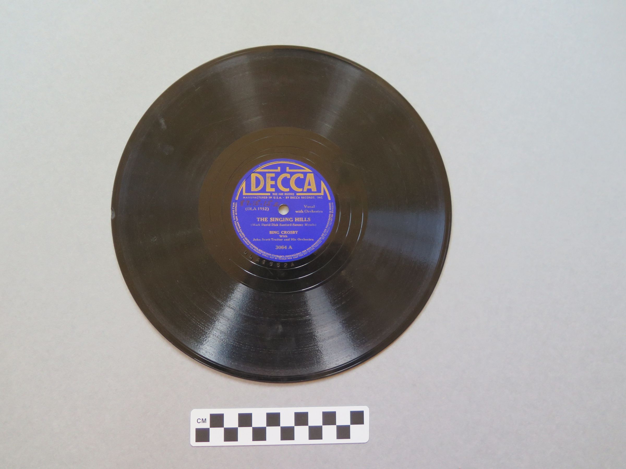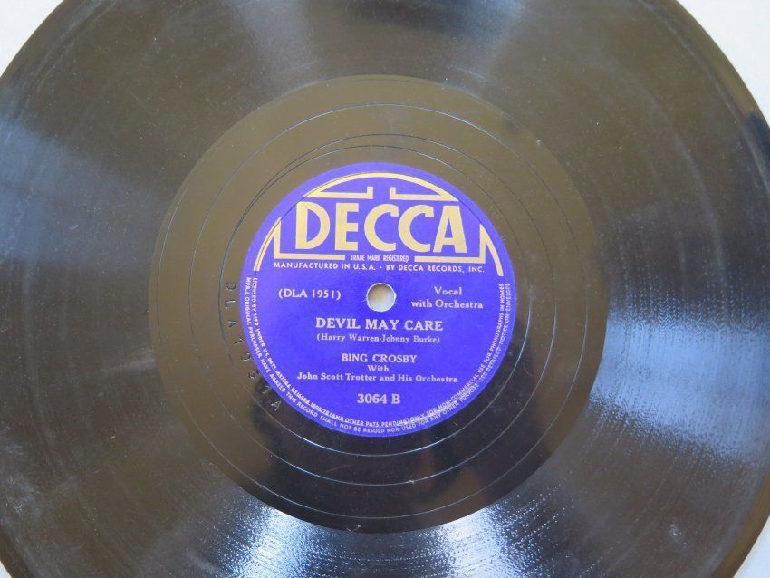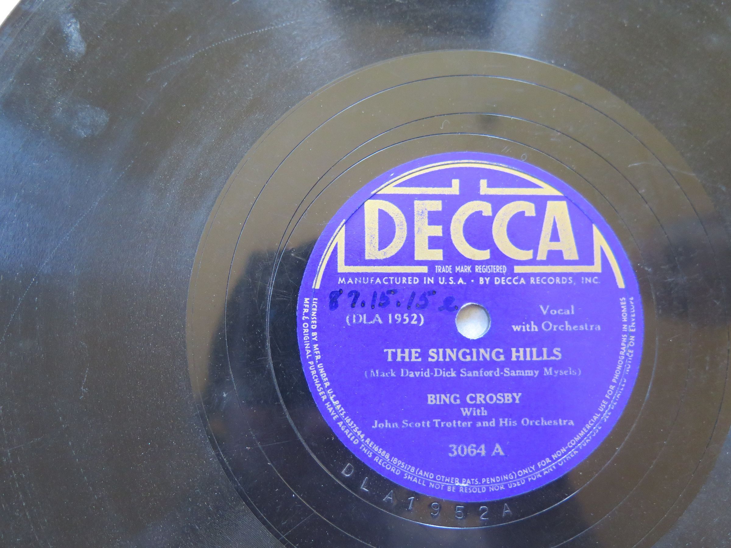 This is a Decca produced record with The Singing Hills on the A side and Devil May Care on the B side. The blue label in the center of the record that text printed on it that reads, "DECCA/ TRADE MARK REGISTERED/ MANUFACTURED IN THE U.S.A. BY DECCA RECORDS, INC./ (DLA 1951) Vocal with Orchestra/ THE SINGING HILLS/ (Mack David-Dick Sanford- Sammy Mysels)/ BING CROSBY/ With/ John Scott Trotter and His Orchestra/ 3064 A on the front and "DECCA/ TRADE MARK REGISTERED/ MANUFACTURED IN THE U.S.A. BY DECCA RECORDS, INC./ (DLA 1951) Vocal with Orchestra/ DEVIL MAY CARE/ (Harry Warren-Johnny Burke)/ BING CROSBY/ With/ John Scott Trotter and His Orchestra/ 3064 B" on the back.Collection