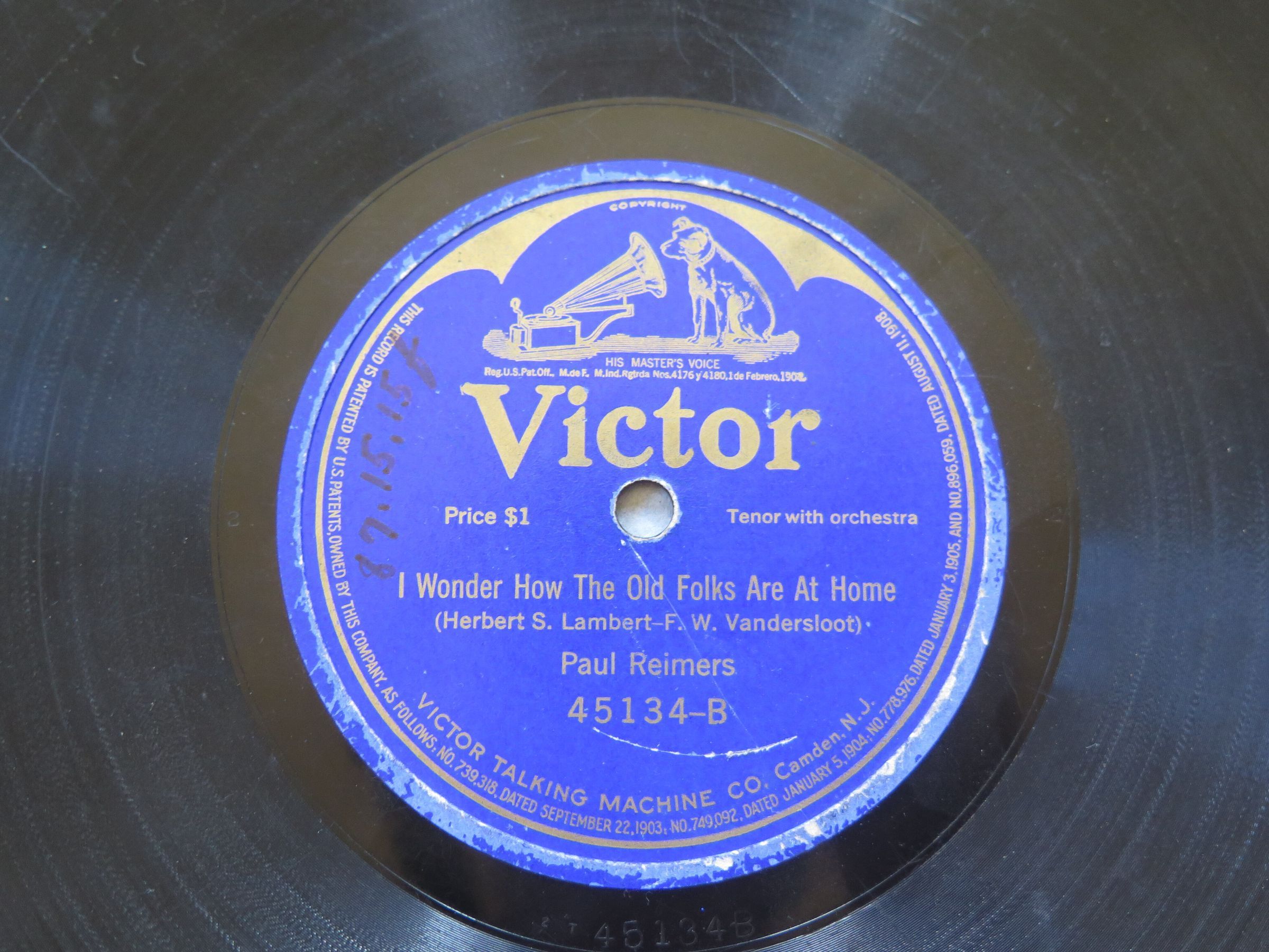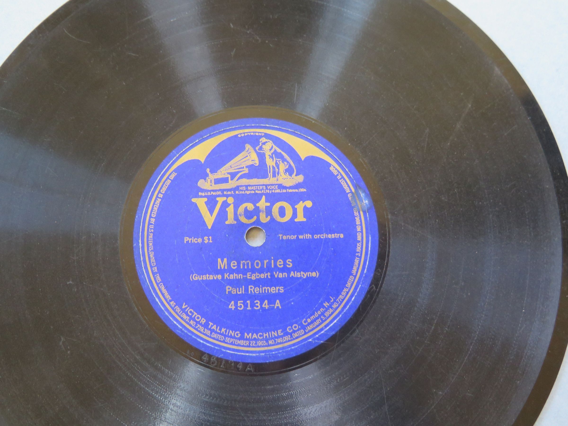 This is an audio record produced by Victor records. It has the songs "Memories" on side A and "I Wonder How the Old Folks Are At Home". The record is 10". Record 1987.15.15g was originally assigned the same number before being renumbered.
