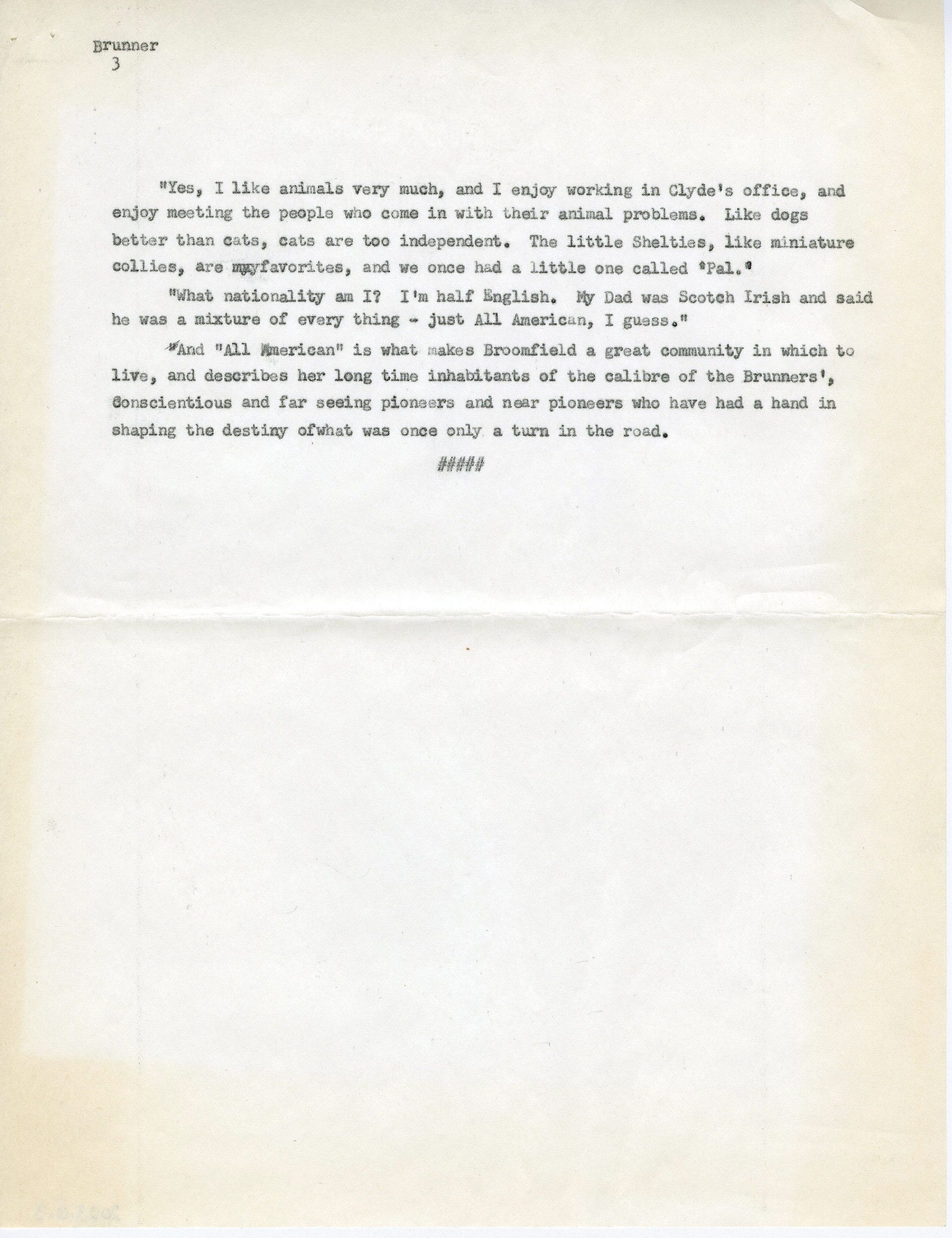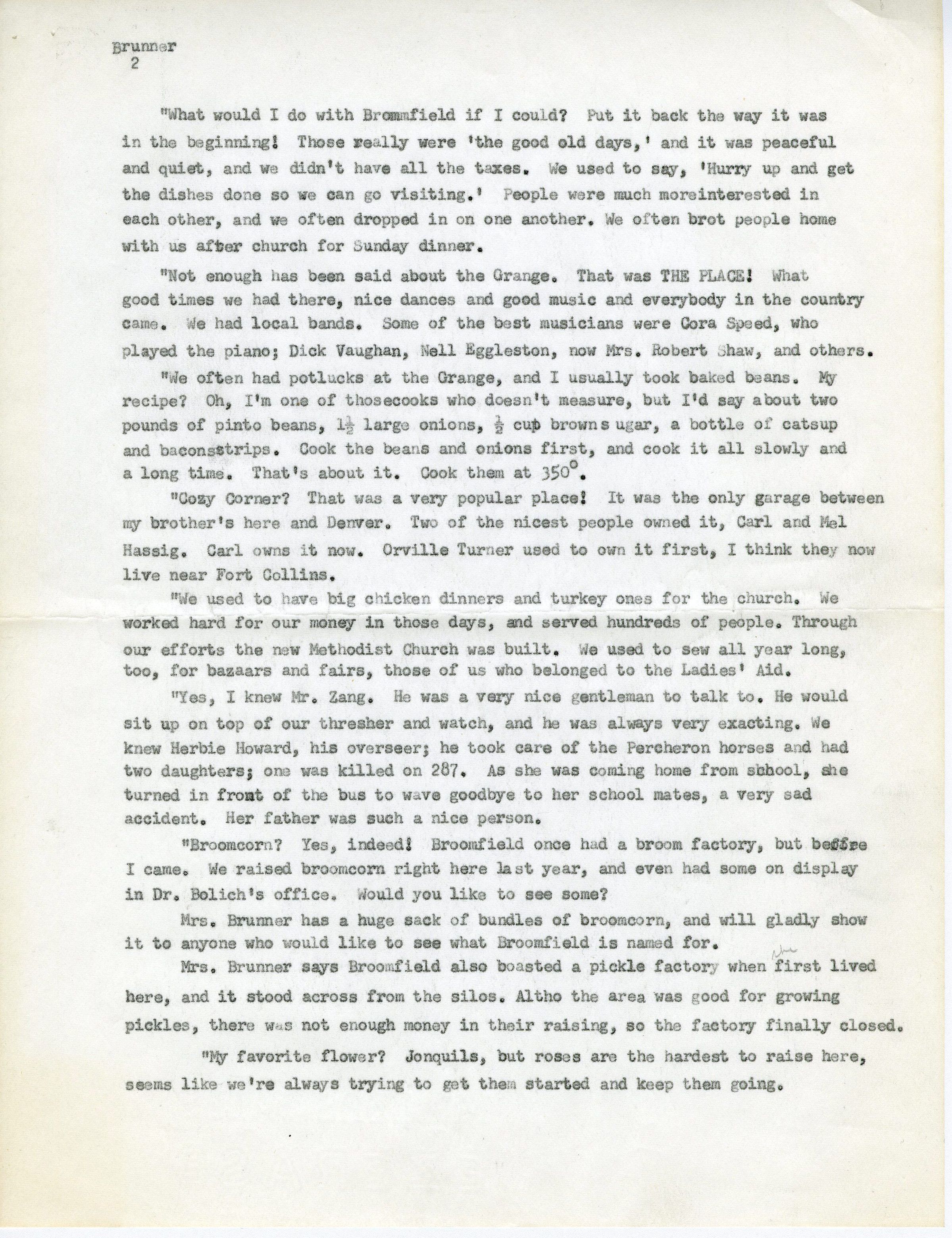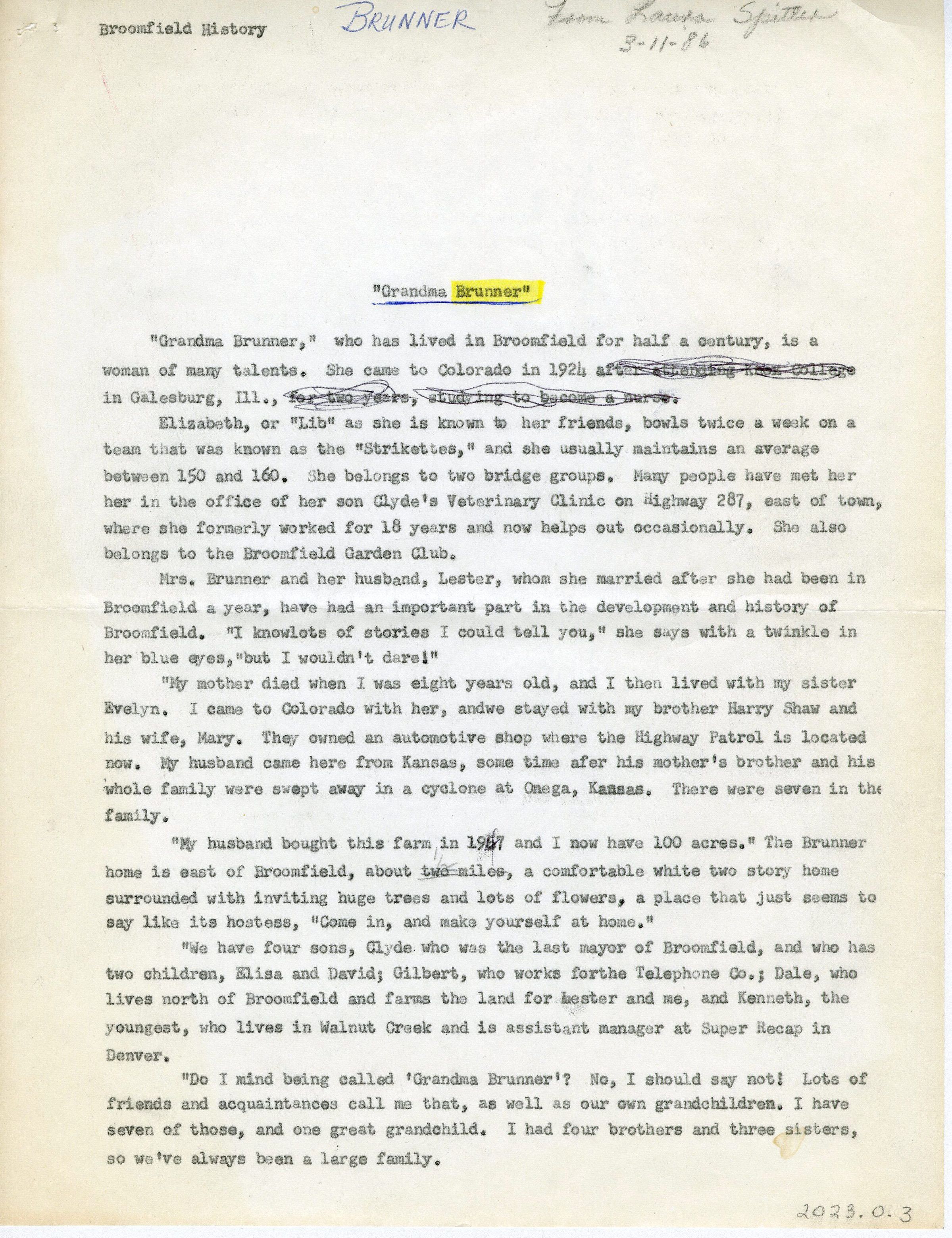Story and interview of Elizabeth Brunner life in Broomfield from 1924 to 1986