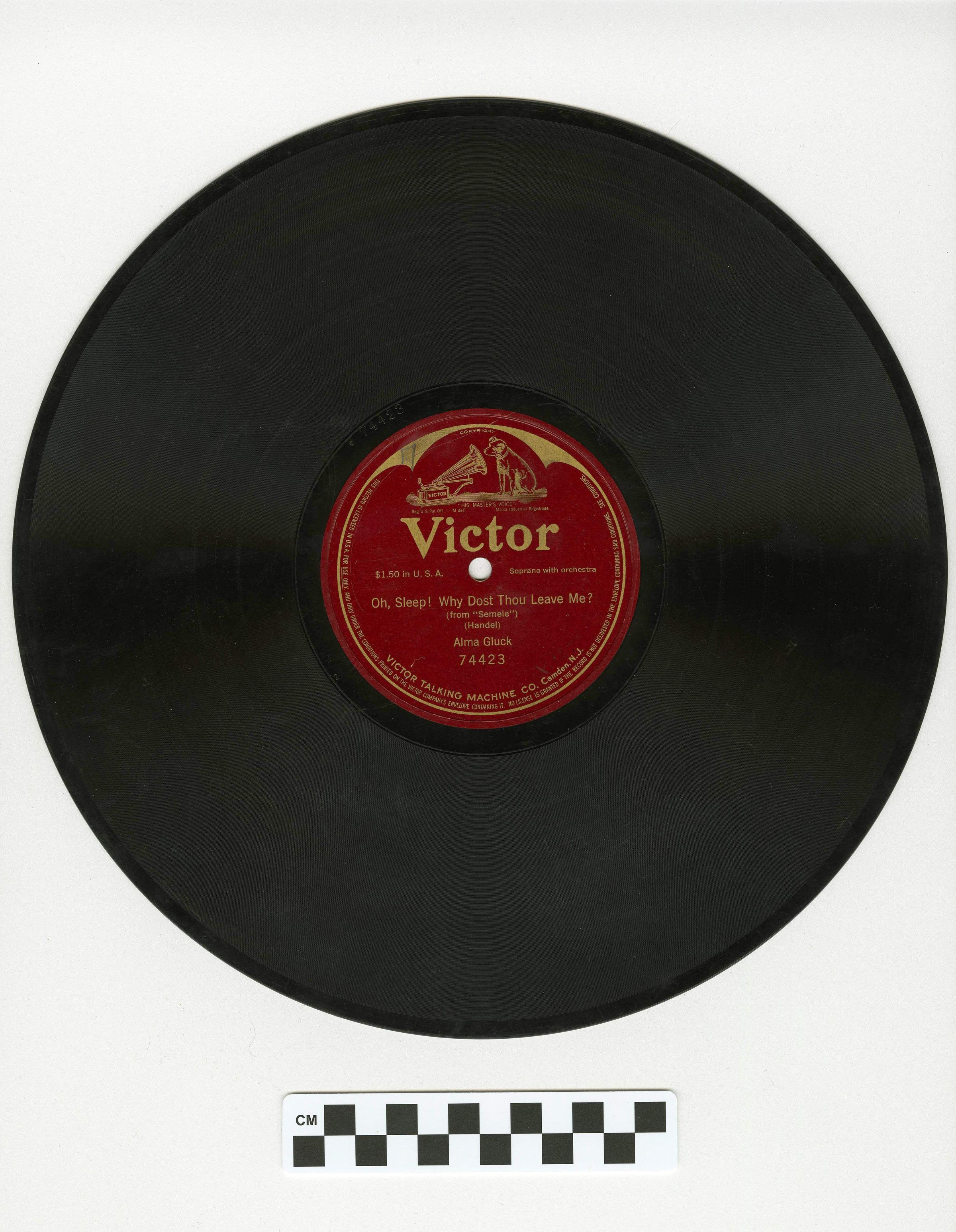 Audio record, 11.75". The record's label was Victor. The song title is "Oh, Sleep! Why Dost Though Leave Me?," artist Alma Gluck.