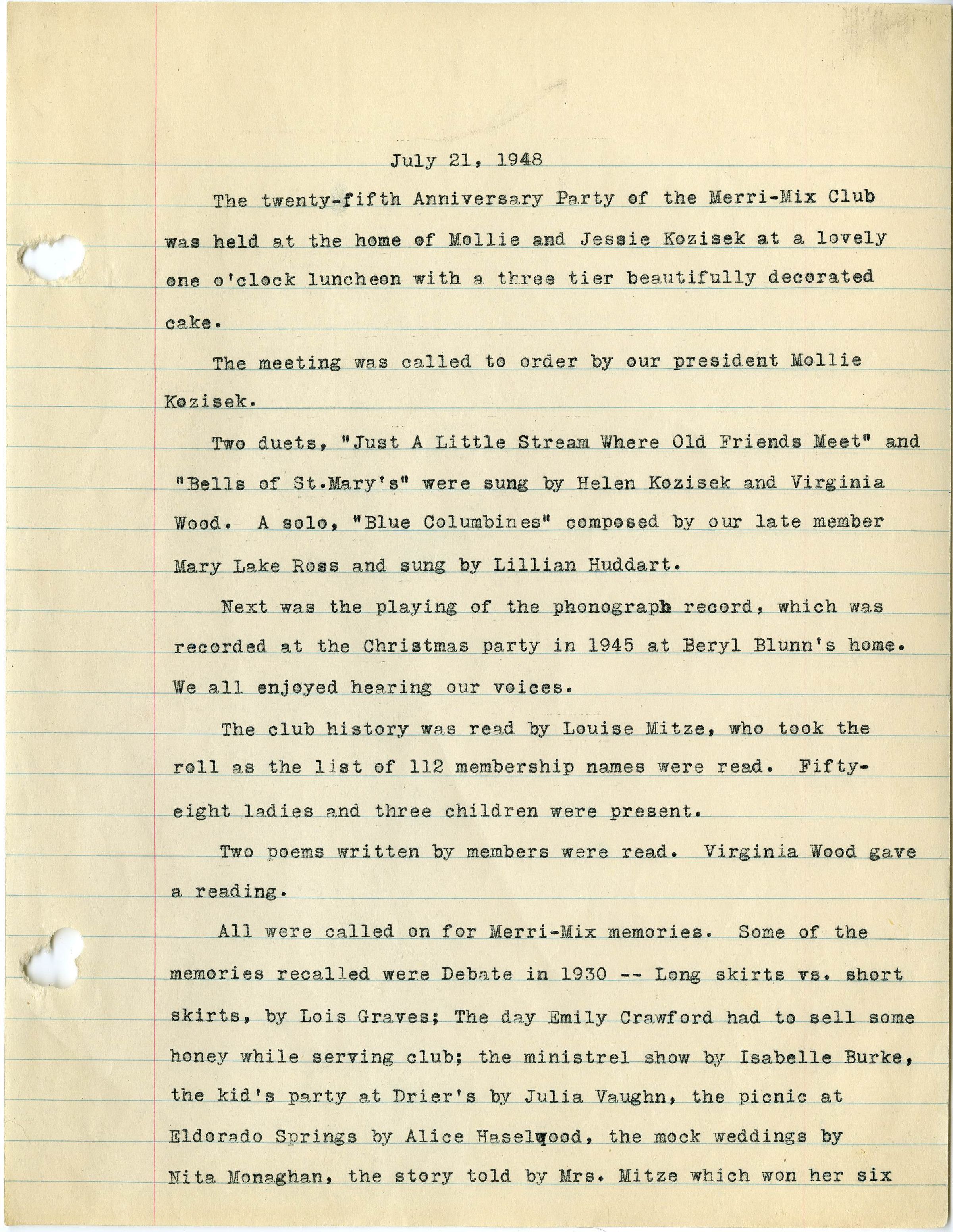 Admin or Biographical History: The Merri Mix Club served as a major social hub for many Broomfield women from 1923 into the 1970s. The main purpose of the club, as stated in its constitution preamble, was for "social pleasure, mental improvement, and mutual help...to form ourselves into a 'Woman's Club.'" Throughout much of its history, the club formed lasting friendships among many Broomfield women and families in the community.