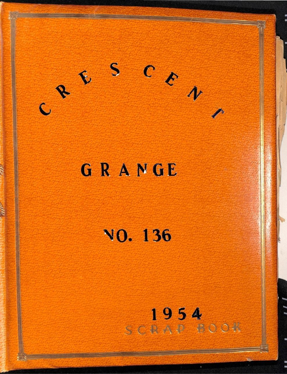Item is a large hard-cover scrapbook compiled by the Crescent Grange, an organization that served as a means of social gathering for early Broomfield residents. The cover of the book is orange with gold accents and the title "Crescent Grange No. 136 / 1954" spelled out with blue stickers on the front. The pages are bound together with string. The scrapbook has a table of contents at the beginning and is separated by month, as well as highlighting various programs and activities in greater detail towards the back of the book. The pages are full of information in the form of newspaper excerpts, photographs and lists of Grange officers, letters and cards from those involved with the group, and crafts and activities done by the Junior Grange. This scrapbook covers the first half of the year 1954.Collection