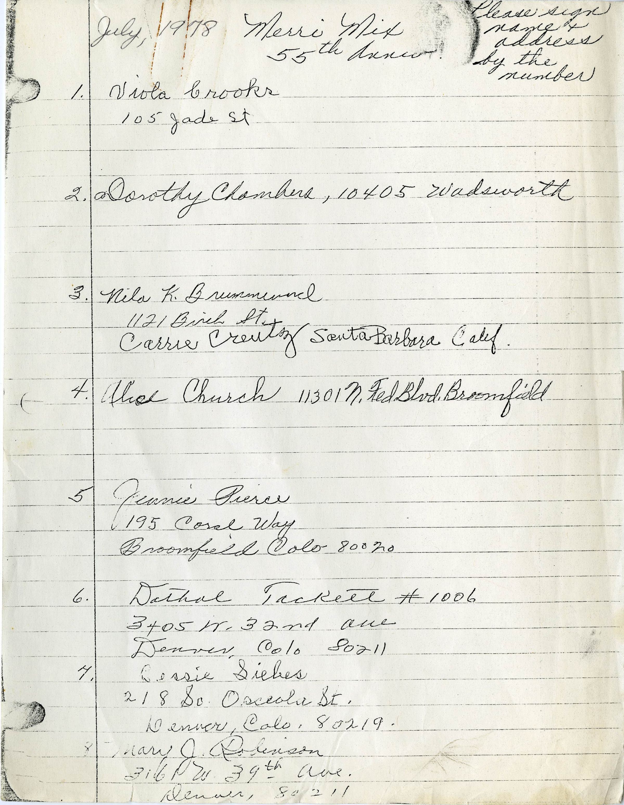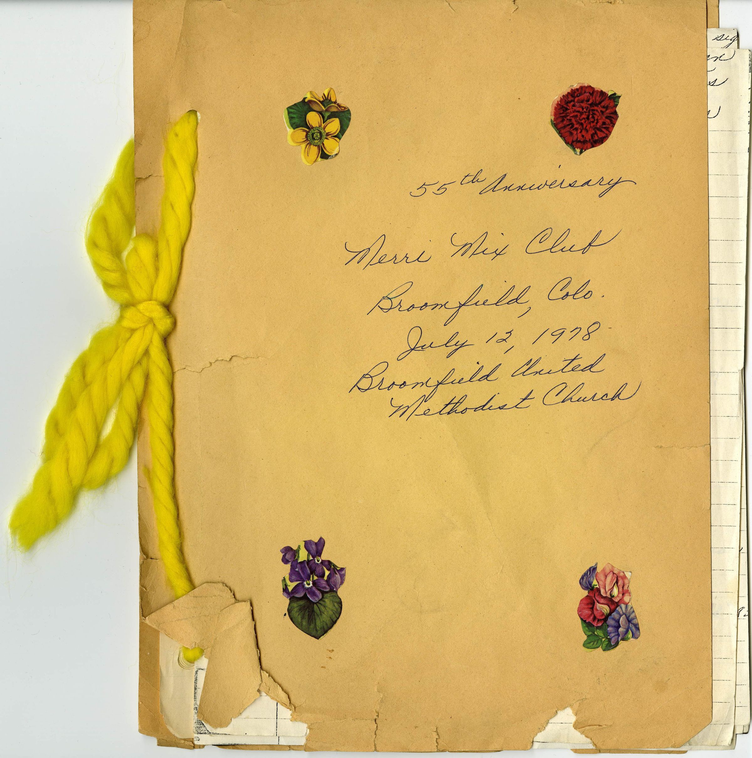 A guest list for the Merri Mix Club's 55th Anniversary event, dated July 12, 1978. The list is 9" x 12", bound in a paper booklet with tied yellow yarn. The cover page is brown with flower stickers in each corner. The event's title and date, and the location at Broomfield United Methodist Church, is handwritten in blue ink in the center of the cover. The document contains the handwritten names and addresses of Merri Mix members on notebook paper, as well as a more focused list of just the names. Noteworthy guests who attended the event include Viola Crooks and Helen Kozisek.