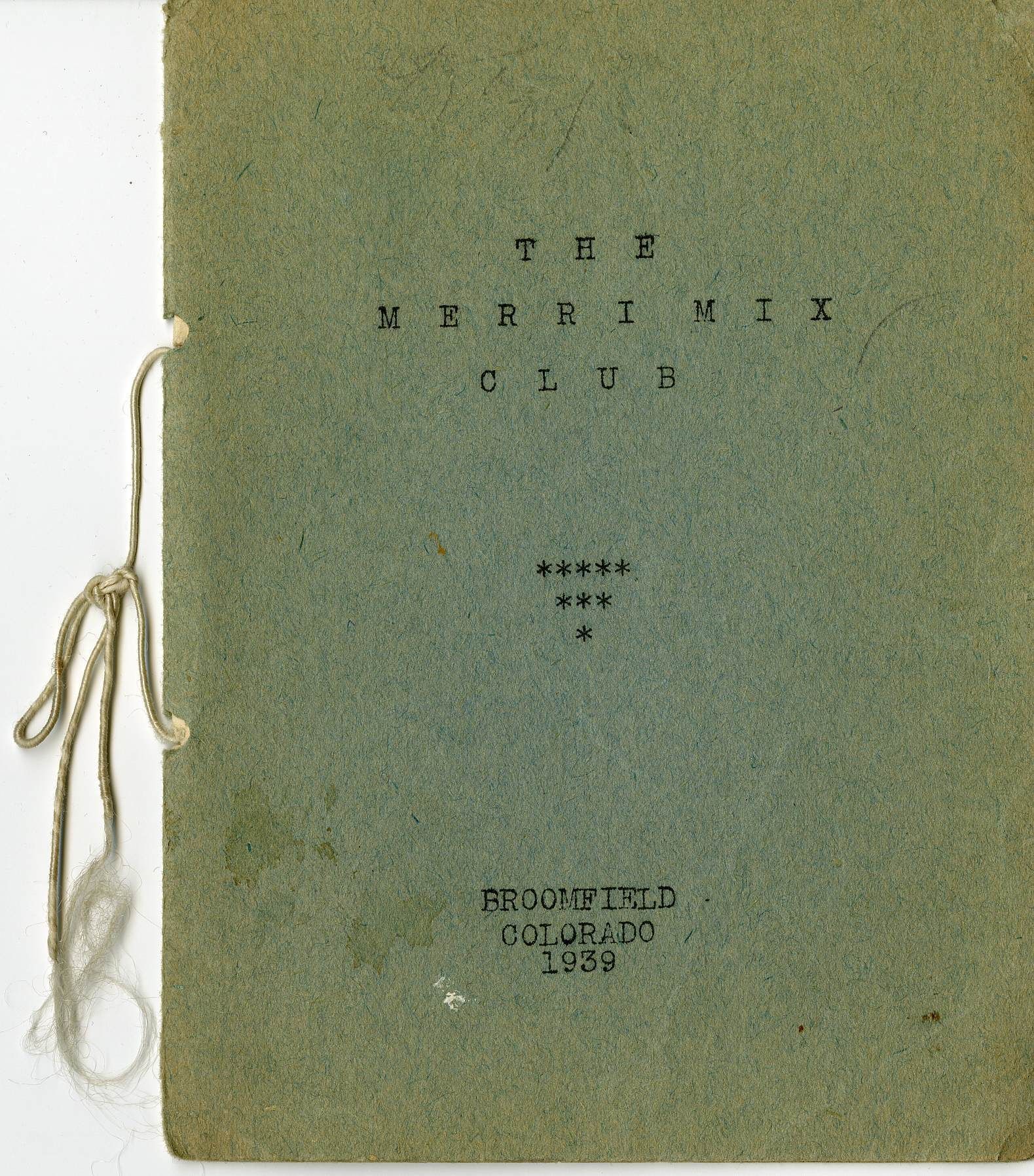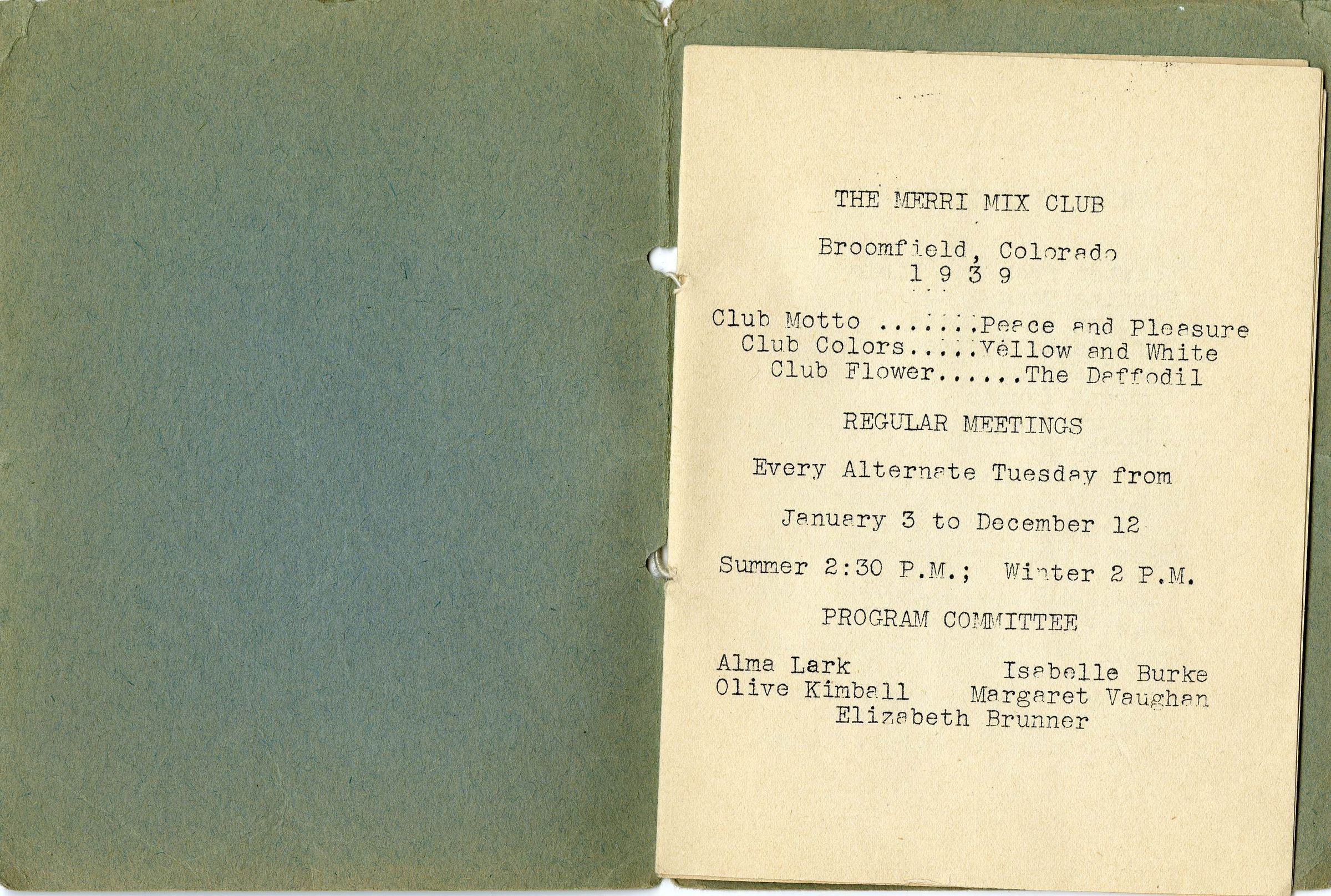 A Merri Mix Club program booklet, 1939. The booklet is 4.5" x 6," string bound. The cover is gray, with the text "The Merri Mix Club" printed in the center followed by a downward-pointing diamond shape made of astrics. "Broomfield, Colorado 1939" is printed at the bottom. The program contains the club's scheduling information for the year 1939, as well as listings of the club motto ("Peace and Pleasure"), club colors (yellow and white), club flower (daffodil), program committee, and meeting order of business. Regular meetings were held every alternate Tuesday from January 3 to December 12, starting at 2:30 PM in the Summer and 2:00 PM in the Winter. The meetings scheduled in the program list the date planned, hostesses, themed roll calls, discussions, performances, presentations, games, and any club elections. Members would often perform songs and dances, or present their papers, poems, and speeches that they created for the club at meetings. Many prominent Broomfield families had multiple women who were club members, such as the Koziseks, Mitzes, Brunners, and Crooks. The program is concluded with a poem, "Sound Advice."